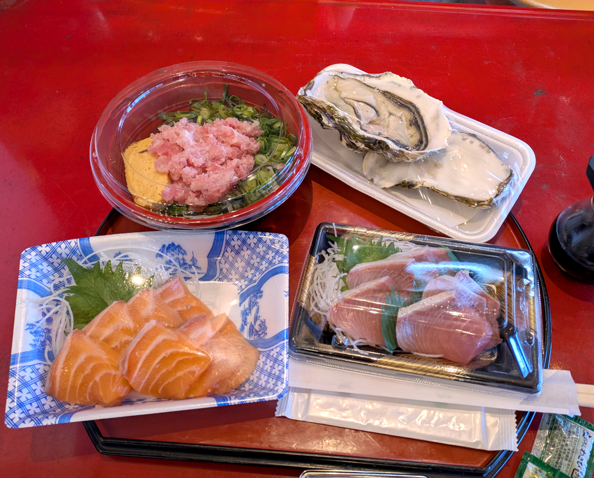 購入したのは、サーモンと桜ブリ(580円×2パックで1000円)とネギトロ丼。それから値段を失念してしまったが、生牡蠣が1つである。揚げ物・煮つけも捨てがたかったが、今回は見送ることにした。