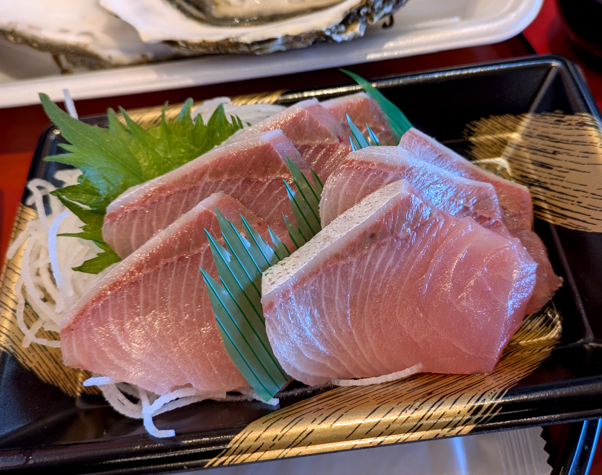 肉質はしっかりしていて味は意外とサッパリ。ブリというと、脂の乗った寒ブリの味が脳裏によぎるが、こちらは身が引き締まっていて脂っぽさがほとんどない。これはこれで好きな味だな。
