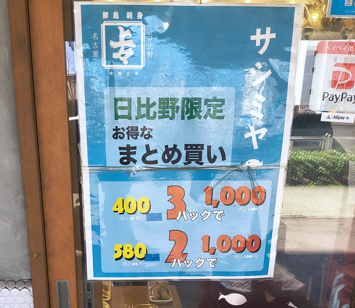 幸い、今回訪ねるつもりだったサシミヤ上々は営業していた! よかった~。乗り換えがわからずに、少し離れた金山駅から約25分かけて歩いてきたんだ。これでやってなかったら無駄足になるところだった。