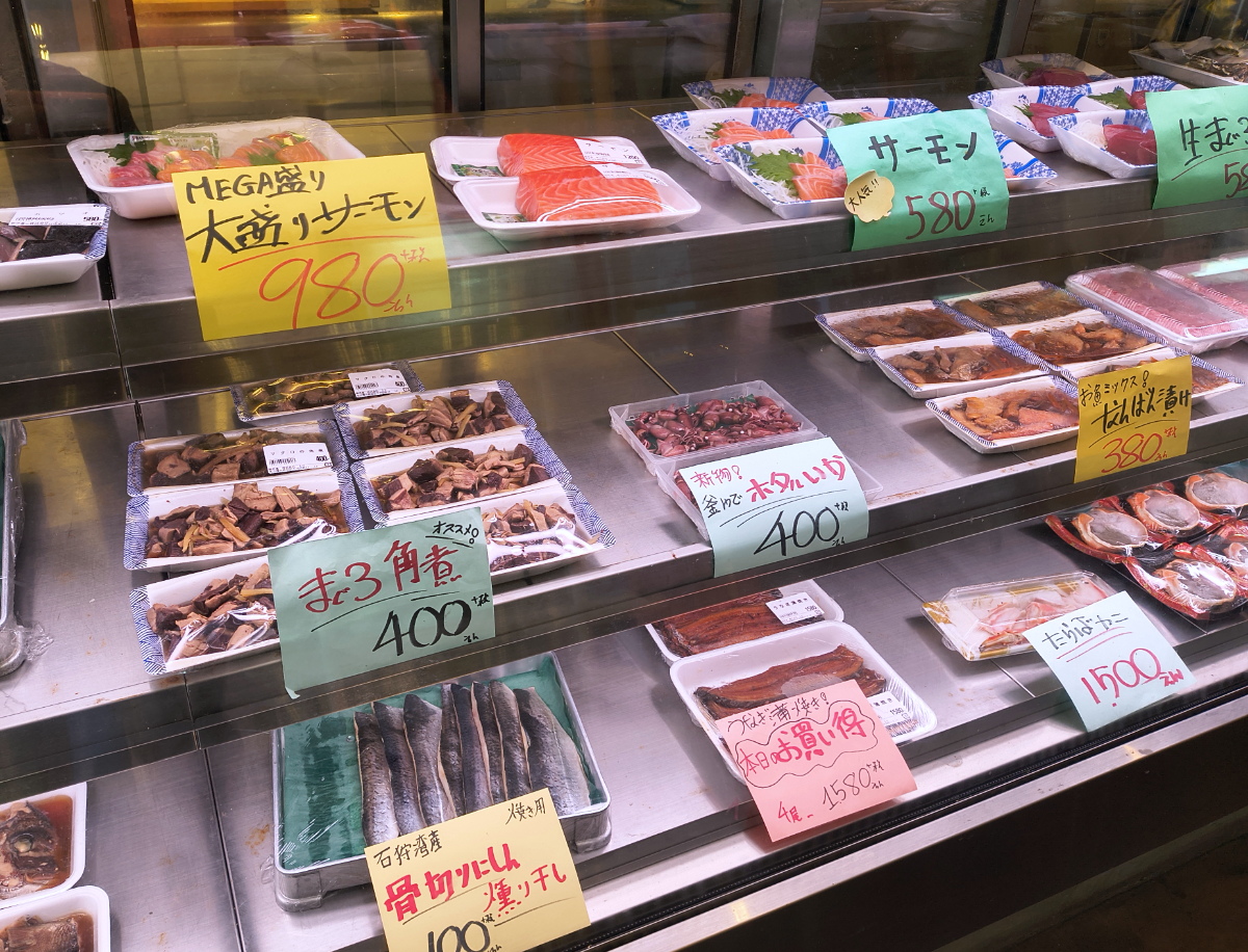 ここには食事のできる魚屋「サシミヤ上々」があり、ショーケースから選んだ新鮮な魚介をその場で食べられてしまうのである。