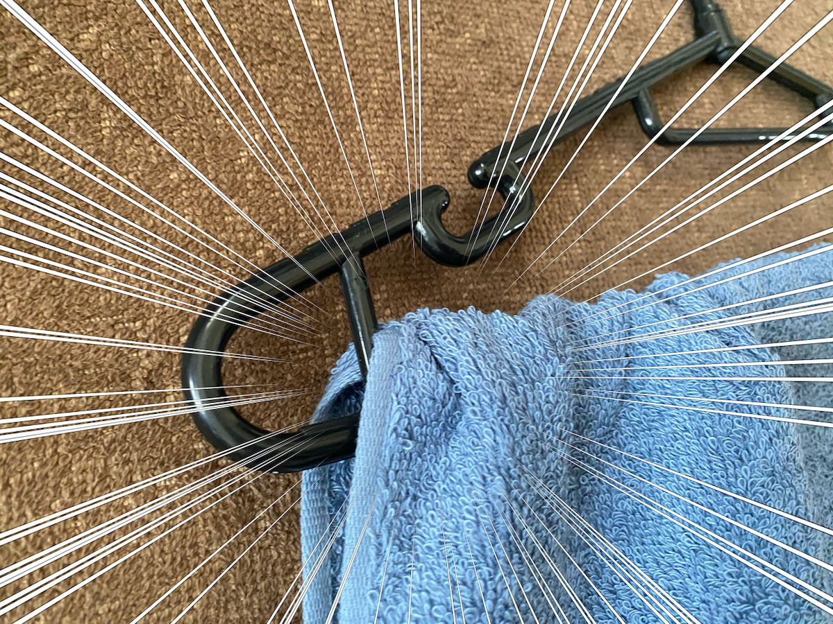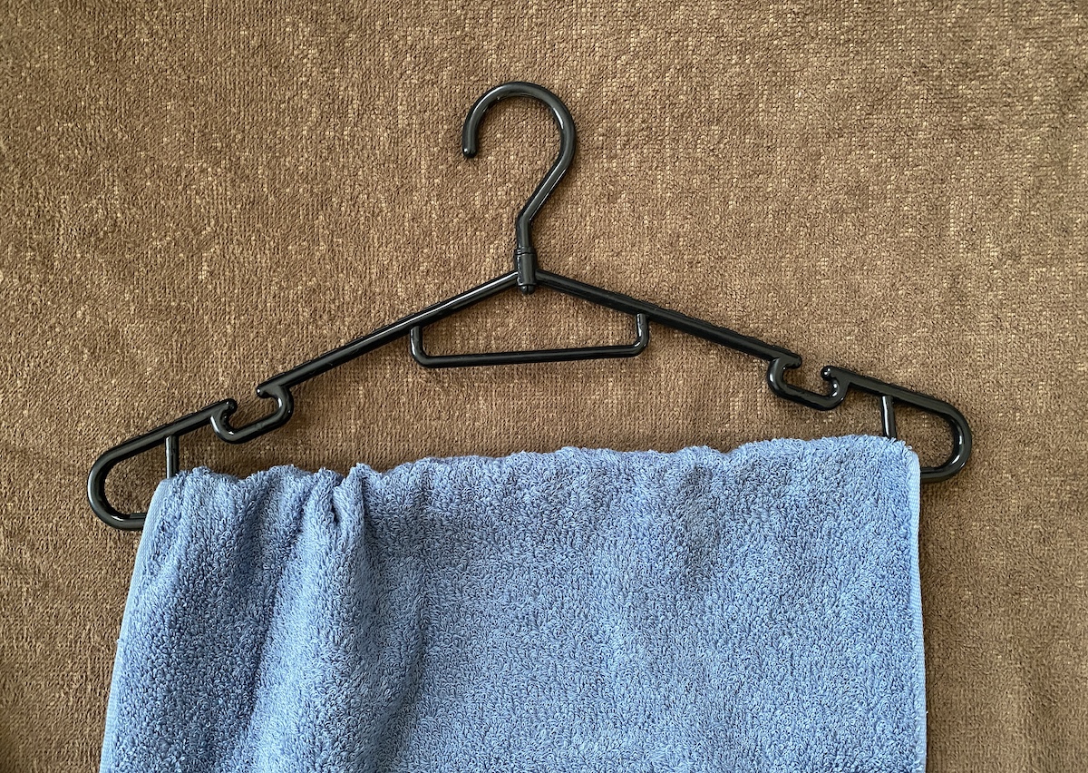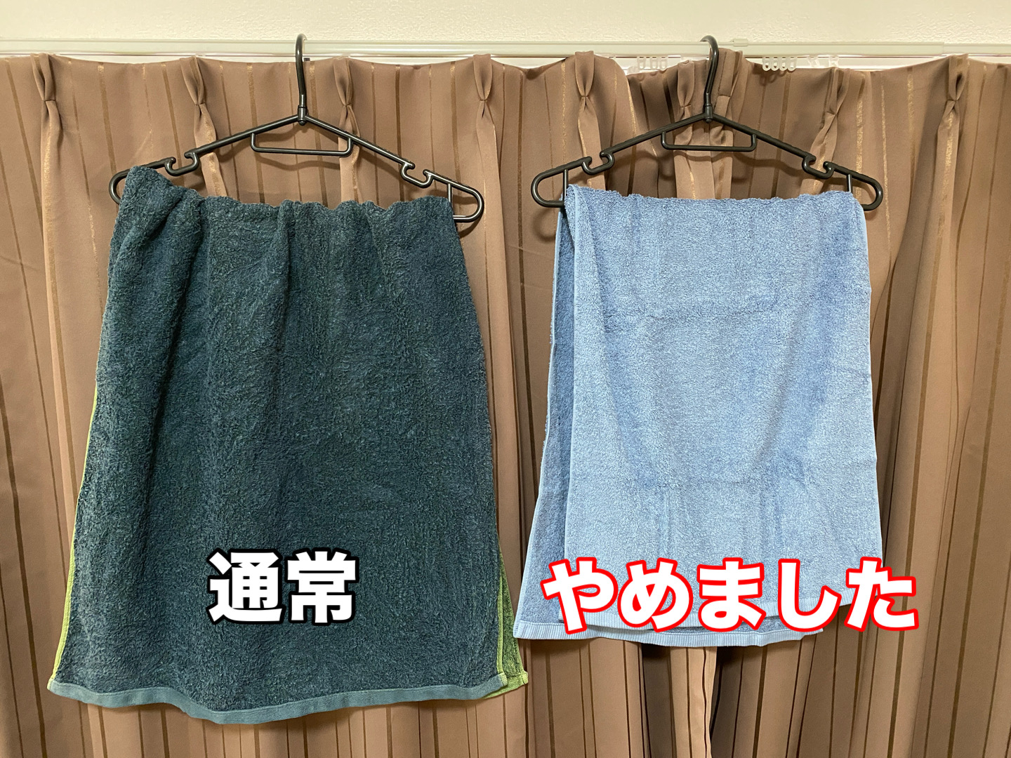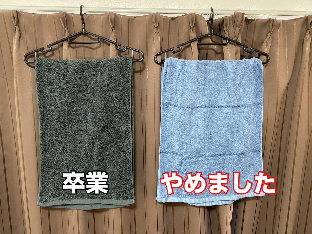 こんな感じで横幅がだいぶ違う。「バスタオルやめました」は服を干すハンガーにフィットするくらいで、普通のフェイスタオルよりはやや長い。