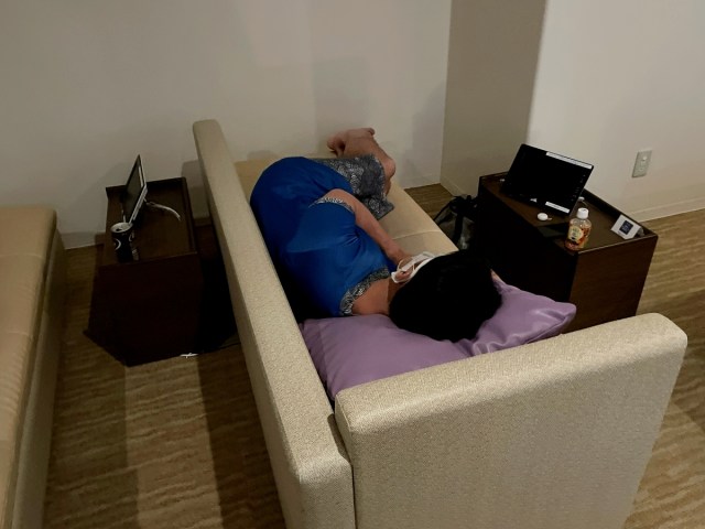 その隣のソファエリアを今夜の寝床に決めた。リクライニングではなく、やはり平らな場所で横になれないと嫌なのだ。