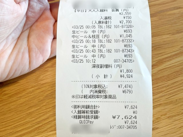 会計は利用料金が4500円、ビール3杯と枝豆セット(ビール+枝豆)が3124円で、合計は税込7624円。