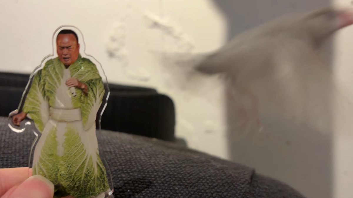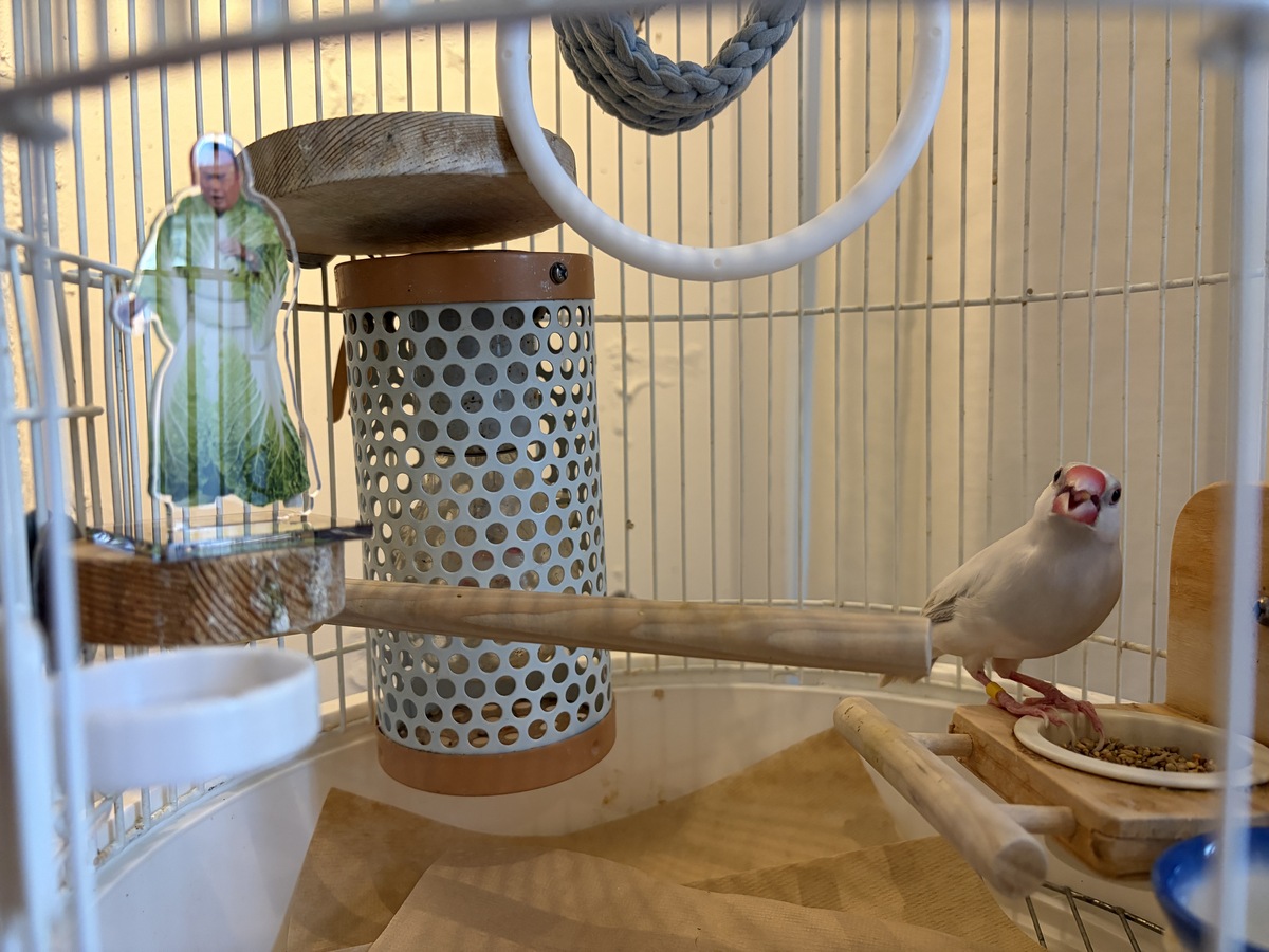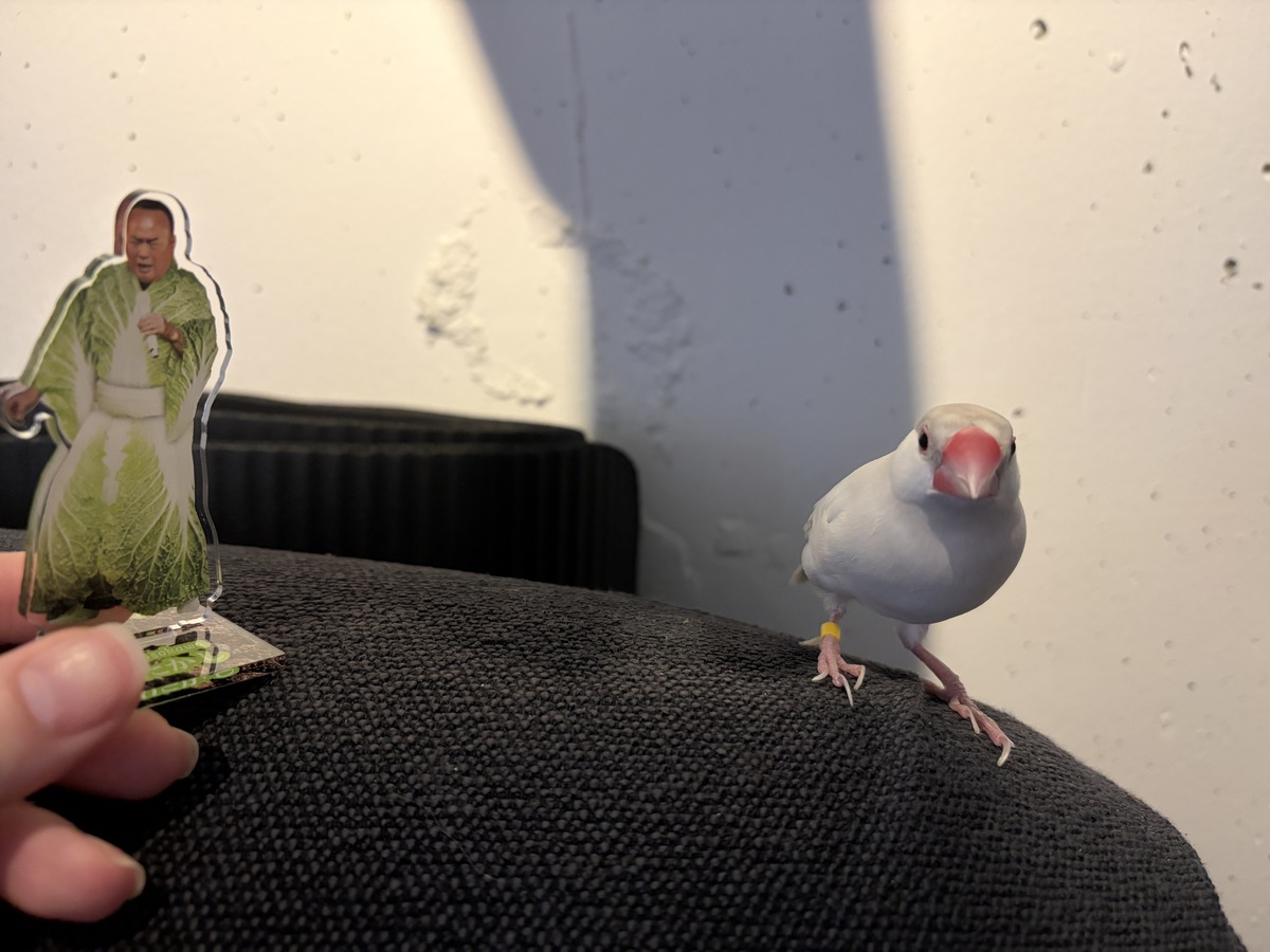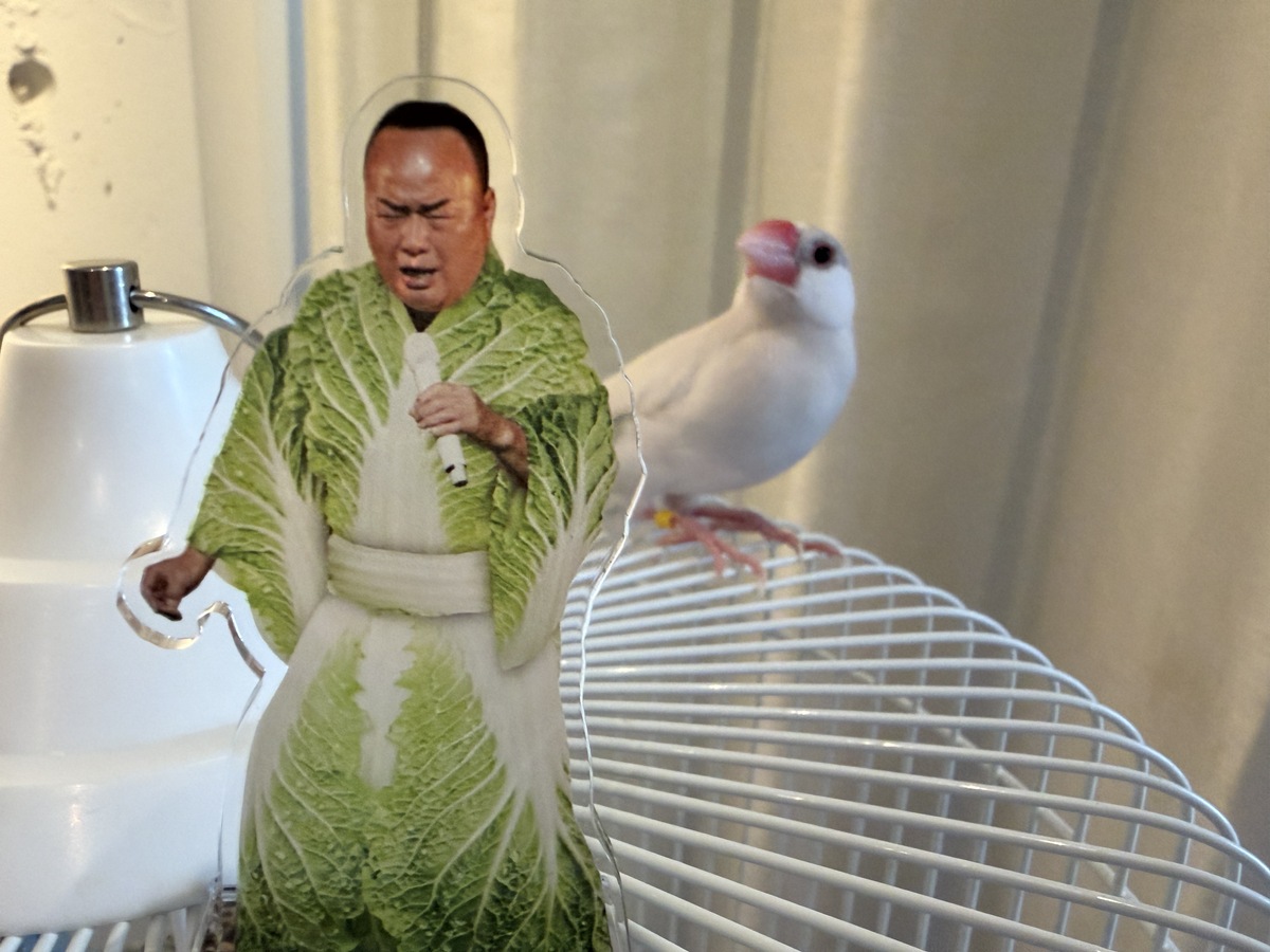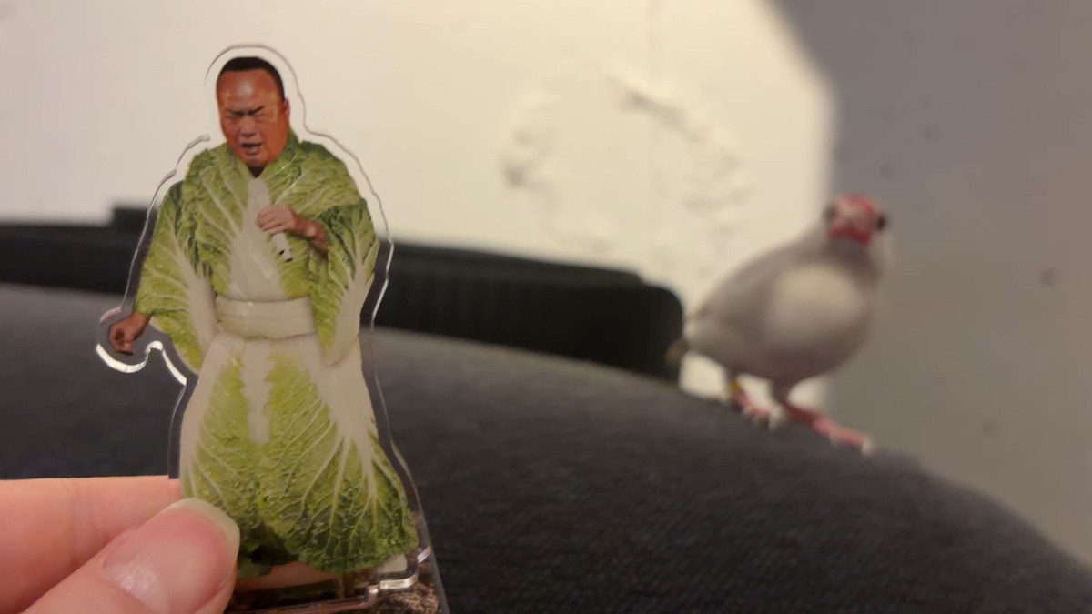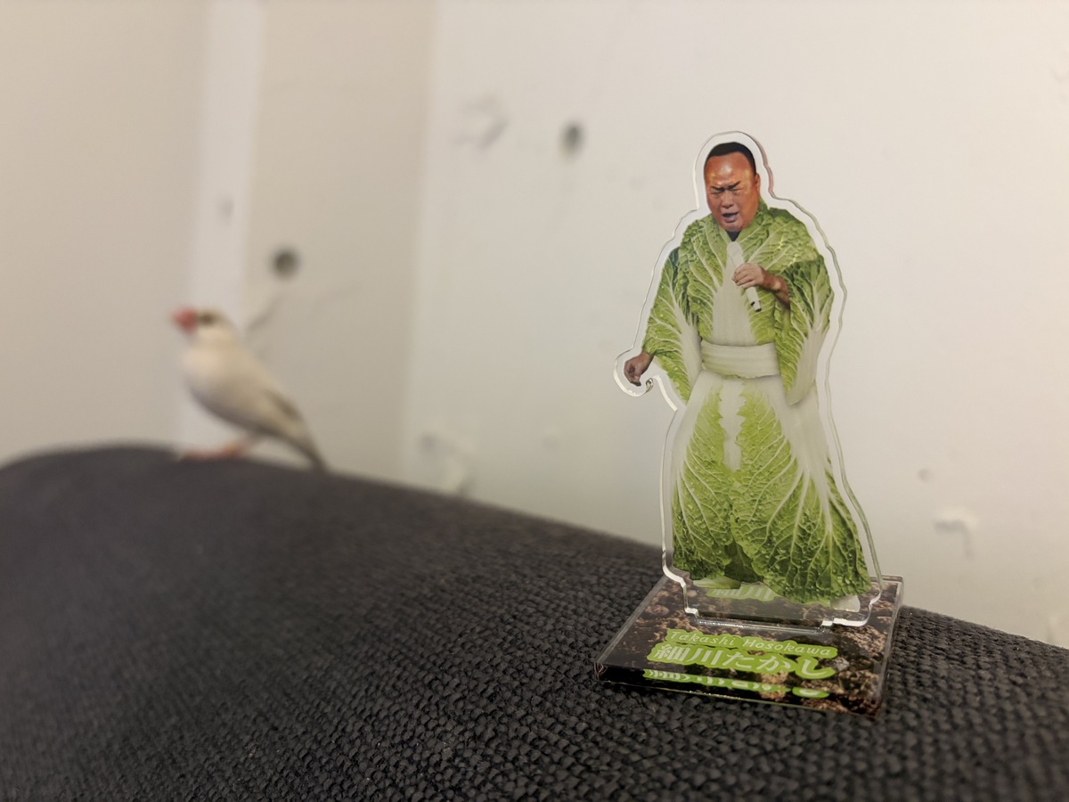 色々とツッコミどころが満載だが、着物の絶妙な色味とサイズ感。それらが奇跡的なバランスでアクスタが「野菜っぽさ」を醸し出しており、キンカチョウの本能に火をつけてしまったのだろう。