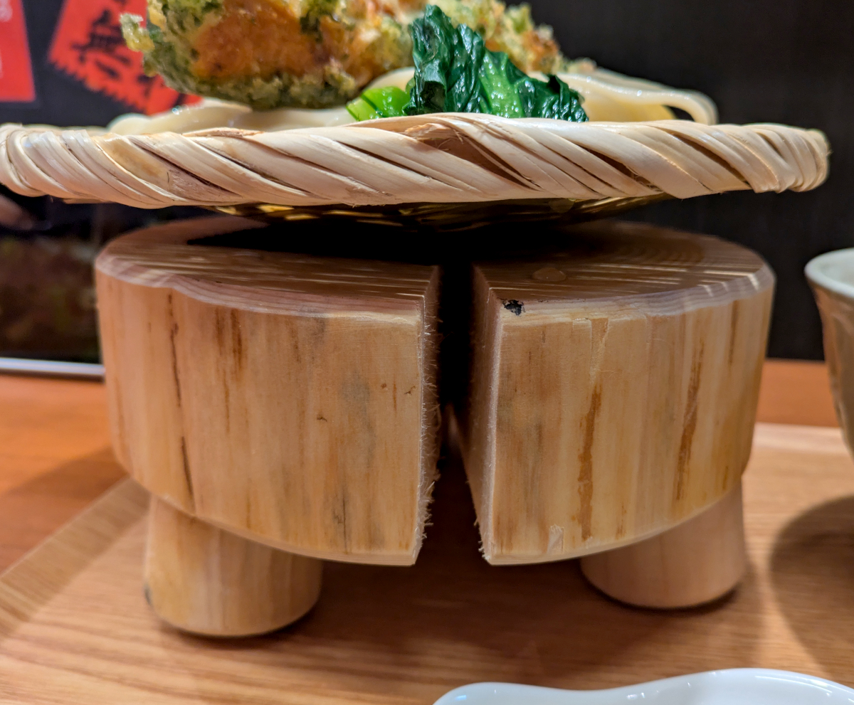 そうして出てきたうどんがコレ。うどんのザルが切り株みたいな台に乗っている。