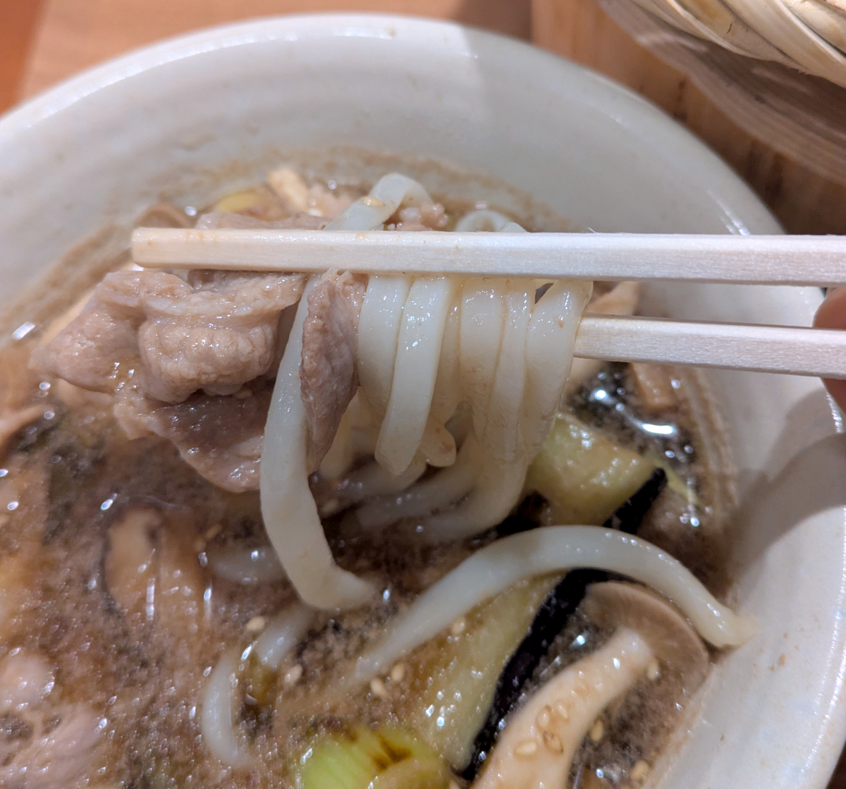 ではさっそく讃岐の方から頂いてみるとしよう。つけ汁には野菜と肉がたっぷり入って、しかもアツアツ。具材をかき分けるようにして麺を突っ込んでひと口すすると、つけ汁の旨味はかなり強い。なおかつ野菜の旨味が十分に出ていて、やや甘めの味付けとなっている。