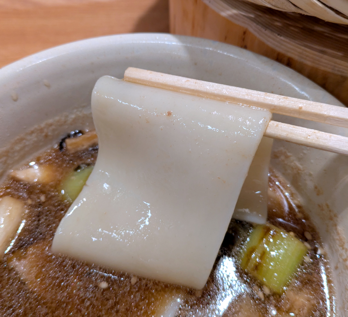 続いて武蔵野の方の一反木麺もいただく。こちらは歯ざわりよりも平打ちらしい、ビロビロとした食感を楽しむべきかも。汁をまとった麺の口当たりが心地よい。