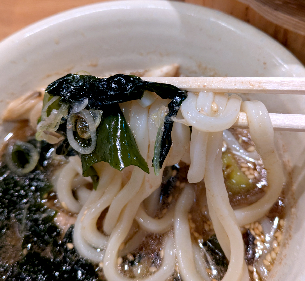 改めてネギ・ワカメ、それからラー油を加えてうどんをすすると、やはり辛味を加えた方がつけ汁の美味しさが際立った。次回利用する際は最初からラー油を投入して食べるとしよう。