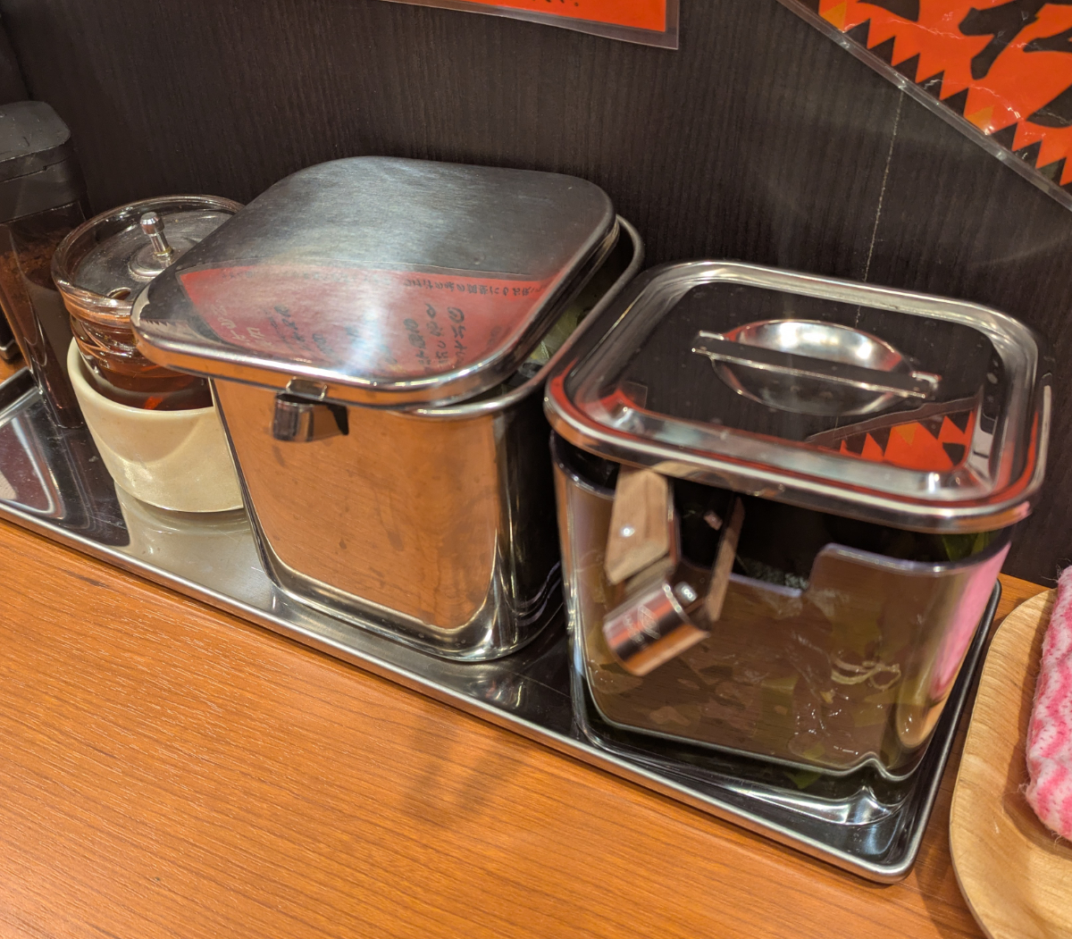 カウンターによく貼られている「美味しい食べ方」はどこでも参考にするタイプです。で、読んでみると……、なるほど卓上のいりこラー油は使った方が良いらしいな。