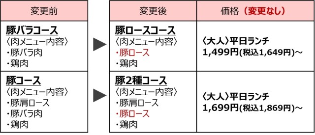 変更後は、値段はそのままで豚バラの代わりに豚ロースが食べ放題になる。『豚バラコース』は『豚ロースコース』に名前が変わるが、価格は変わらず平日ランチ税込1649円~。