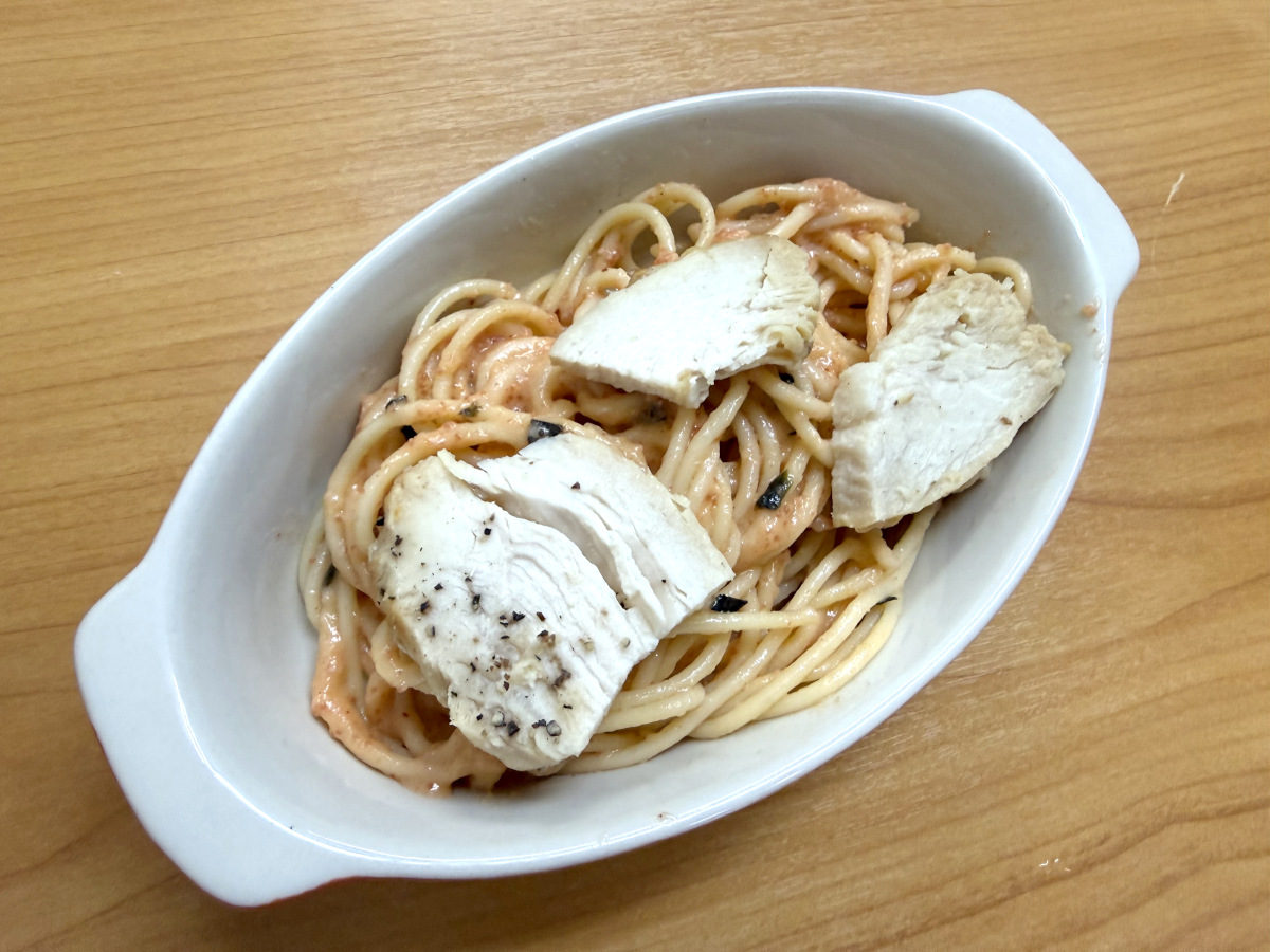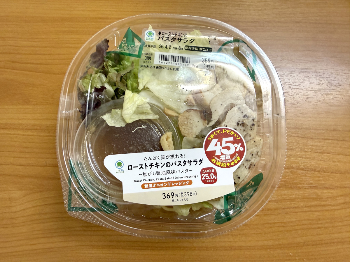 ただし、あまりの圧倒的ボリュームに1回では食べ切れず「後でまた食べようかな……」とギブアップしかけていたことも事実。さらにもう1つ買っていた「ローストチキンのパスタサラダ(398円)」は手つかずのままだ。