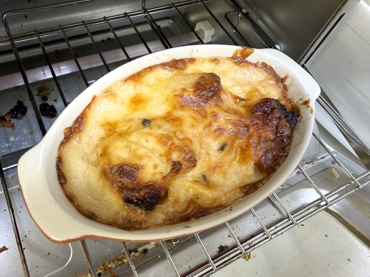 中岩係長「そこにホワイトソースとチーズをたっぷりのせてくれ。あとはトースターで焦げ目が付くまで焼けば明太子スパゲティグラタンの完成だ。ウマいぞ!」