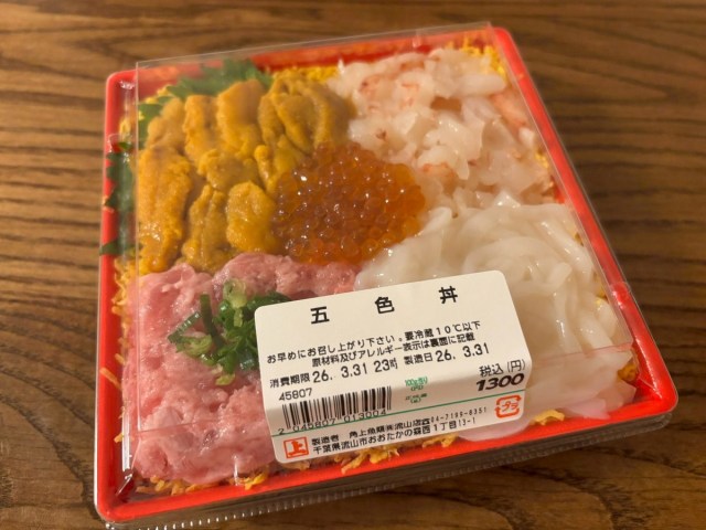うに・いくら・えび・まぐろたたき・いかの5種がのって、価格は税込1300円。