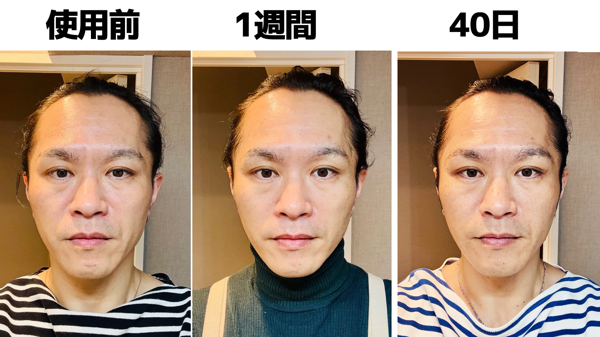 「これ、本当に効くのかな?」と思いながらも、ふと気づけば今日で40日が経過した。使用開始1週間の比較写真は効果アリに見えたが、はたして今回は……?