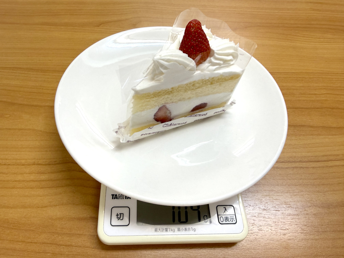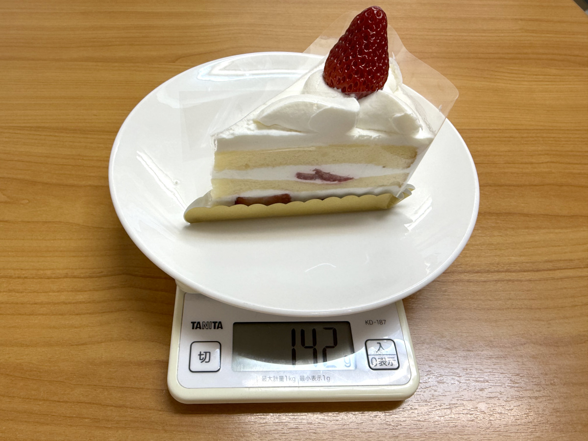 で、食べ始める前に重量を計測してみたところ、不二家のショートケーキが142グラムでシャトレーゼのショートケーキが104グラムであった。つまり不二家の方が1.3倍以上大きいことになる。