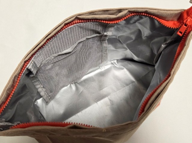 ▼バッグは撥水加工が施されていて、中身は簡易保冷仕様。保冷剤を入れるメッシュポケットも付いてます。