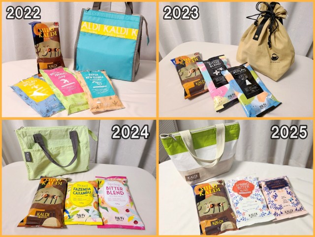 カルディの人気商品「春のコーヒーバッグ」を4年連続で購入し中身を比べてみたところ…店頭で泣いてレジ横でも泣いた