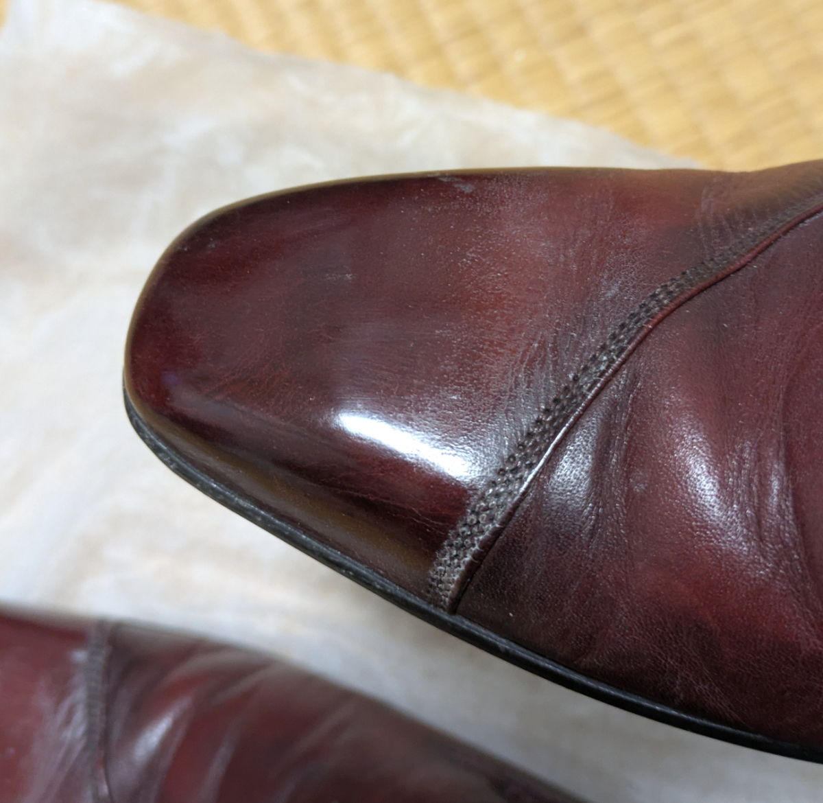 これが鏡面磨きか! たしかに鏡みたいに光を反射している。ここまでキレイになるもんなんだ、靴って!