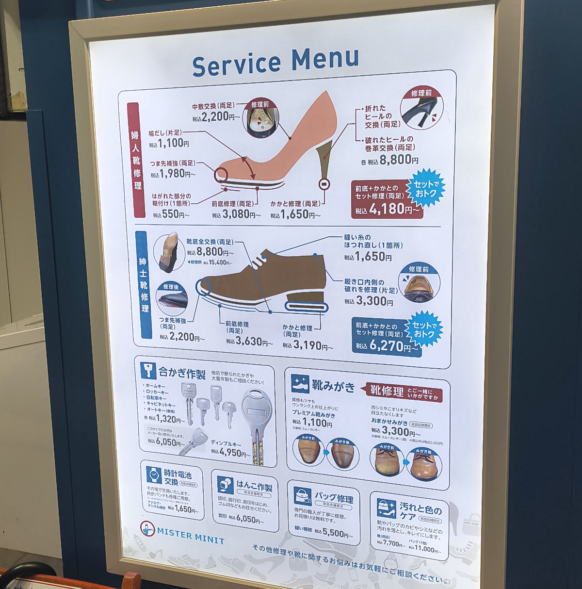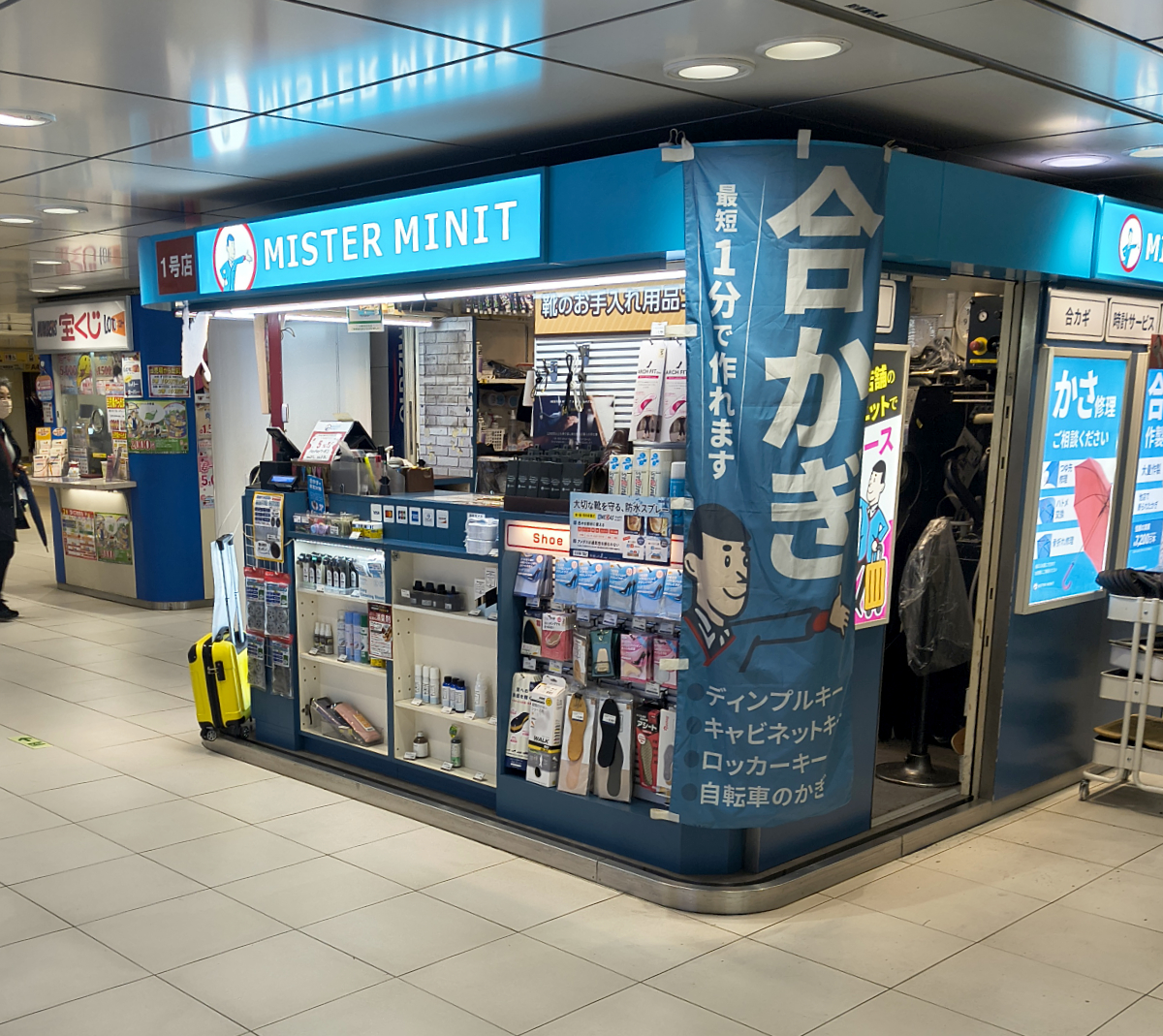 ここはひとつ、プロの力で輝きを取り戻して頂こう。ということで、有楽町や新橋の靴磨き専門店に行こうかと思ったけど、あいにく時間がない。そんなときこそ「ミスターミニット」だ。