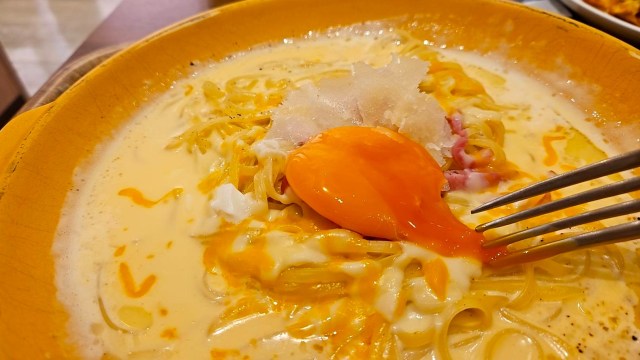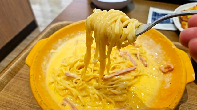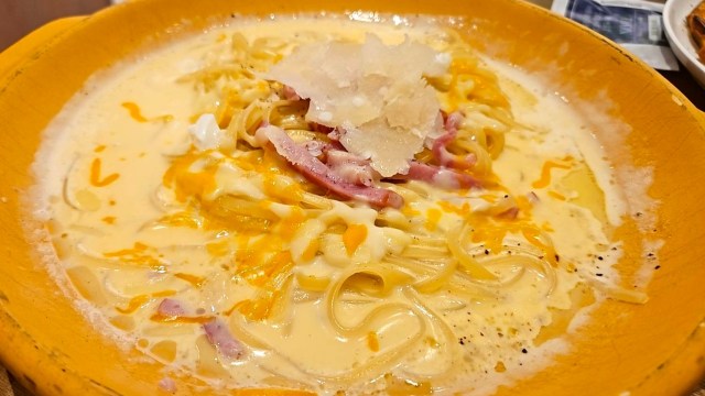 いやぁ~参った。想像以上じゃん! これ、過去イチ濃厚なカルボナーラかも。口当たりがド濃厚なのに、後味が不思議とクドくないのもイイ。もちろん麺もモチモチで美味い。