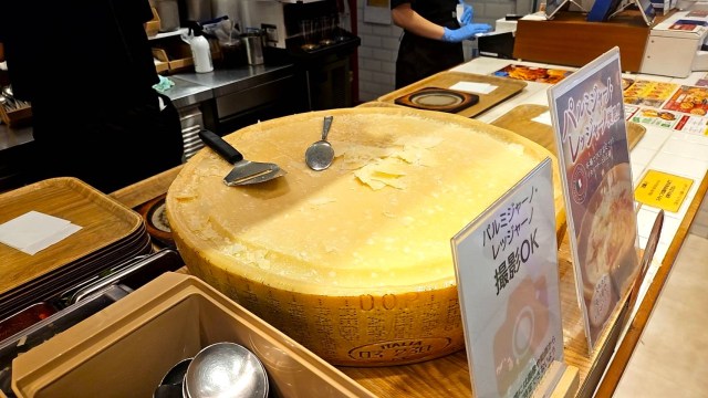 仕上げには、巨大なパルミジャーノ・レッジャーノをパスタにふりかけるパフォーマンス付き。