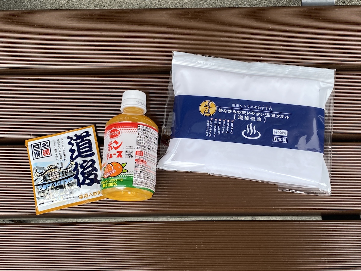 今回、せっかくなので道後温泉のもと(1袋132円)、ポンジュース(194円)、昔ながらの使いやすい温泉タオル(440円)を購入。これだけでも愛媛気分を味わえた。