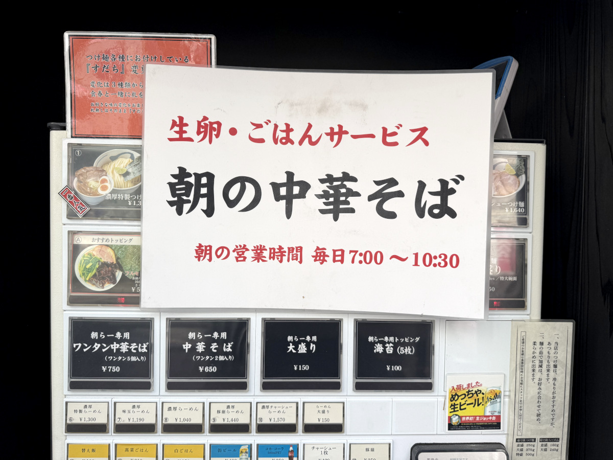 というわけで、そのまま食券を購入して つじ田の朝ラーを食べてみることに。なお、大盛りは150円、海苔5枚トッピングは100円となっている。