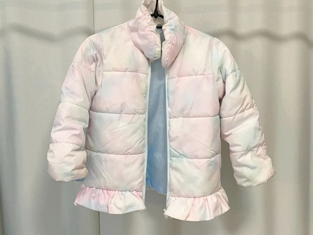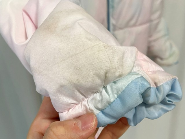 1着目は5歳の娘のダウン。白っぽいピンク色で、特に袖の黒ずみが目立つ。