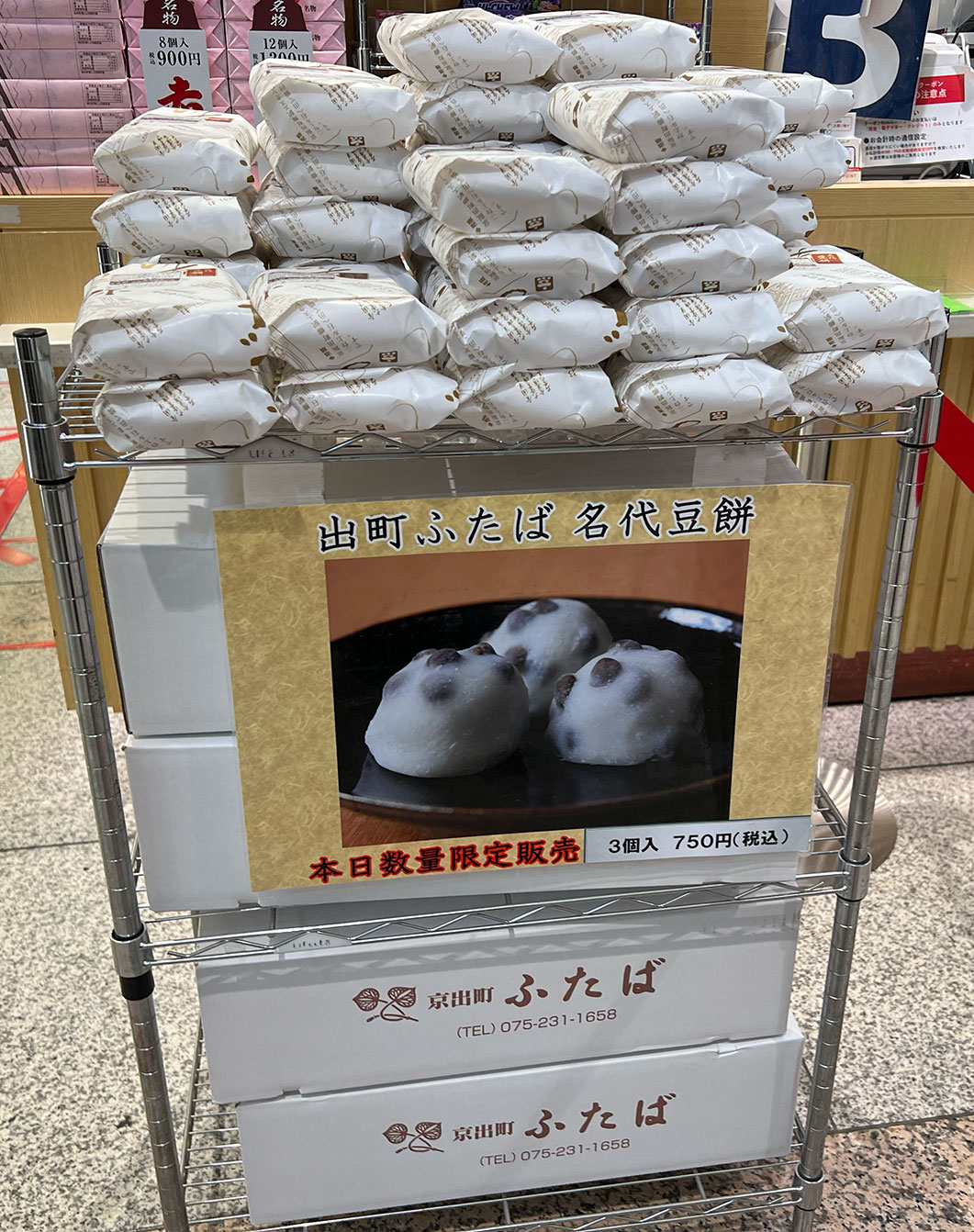 『JR東海リテイリングプラス』によれば、ふたばの豆大福は京都駅構内の複数のお店で販売されているとのこと。ただし、毎日ではなく「この店は月・金・日曜日に販売」「この店は水・木・土曜日に販売」という感じ。