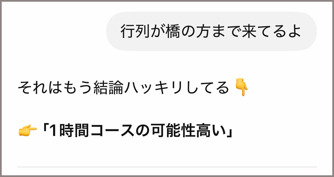 意外と行列がサクサク進んで10分くらいで買えるならいいが、長時間かかるとしたら厳しい。一体どれくらい待つのだろう? 気になったので、AIに相談してみたところ……
