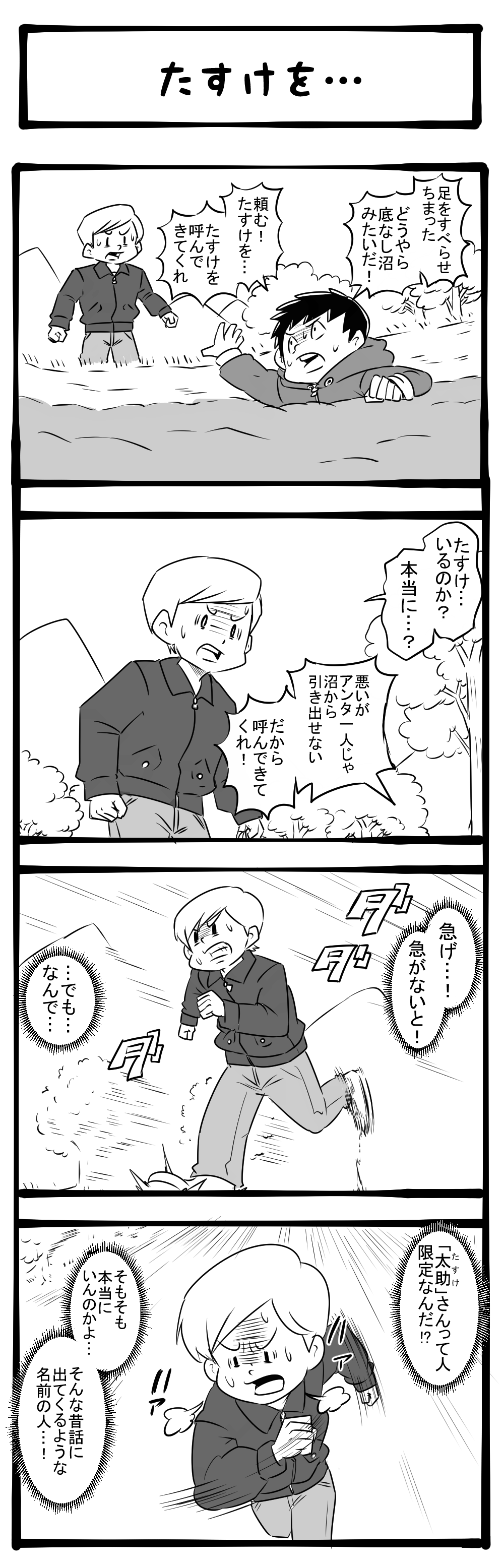とにかく急げ! 半信半疑で駆けだした青年! 四コマサボタージュBYD第337回「たすけを…」
