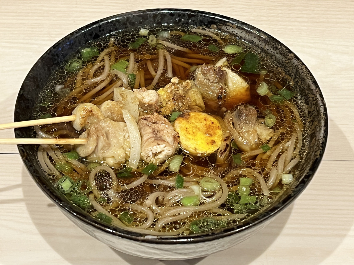 とは言え、そばを食べると鶏もつ焼きの香ばしい香りがして、甘めのつゆも相性は悪くない。なんでもない麺ともつのコリッとした食感のコントラストも面白く、味的には確かに合っているかも。