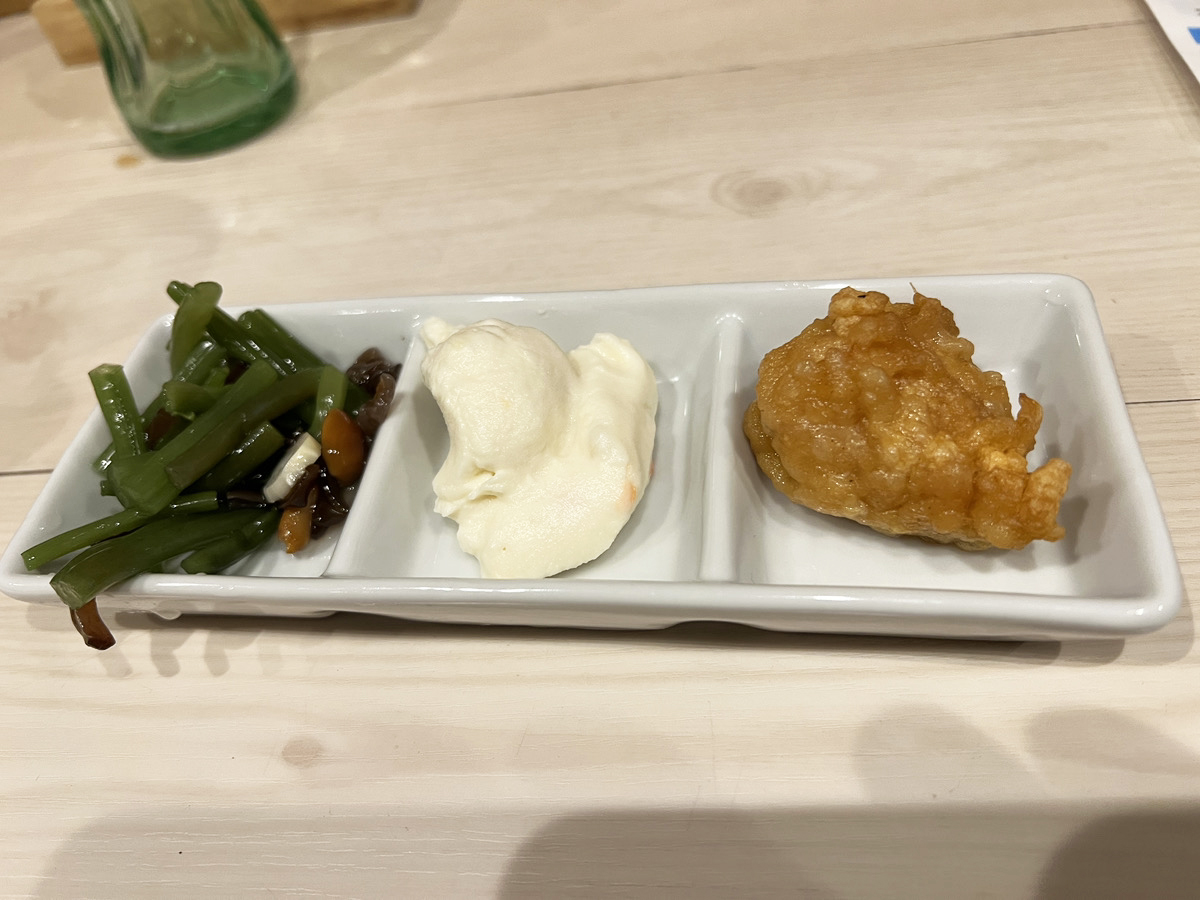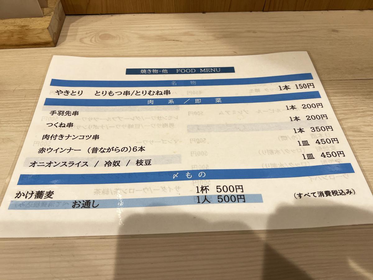 メニューも串とちょっとしたツマミと酒がメイン。まずお通しが出てくる昔ながらの飲み屋で、お通しは500円だった。