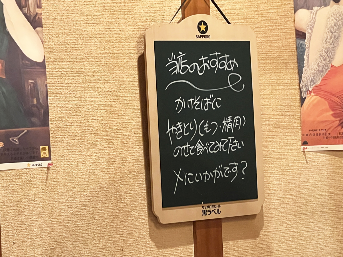 いきなり〆に行くのもなんなので、コカ・コーラ(税込350円)を注文してまったりしていたところ、店内の小さい黒板でも串そばがオススメされているのを発見。