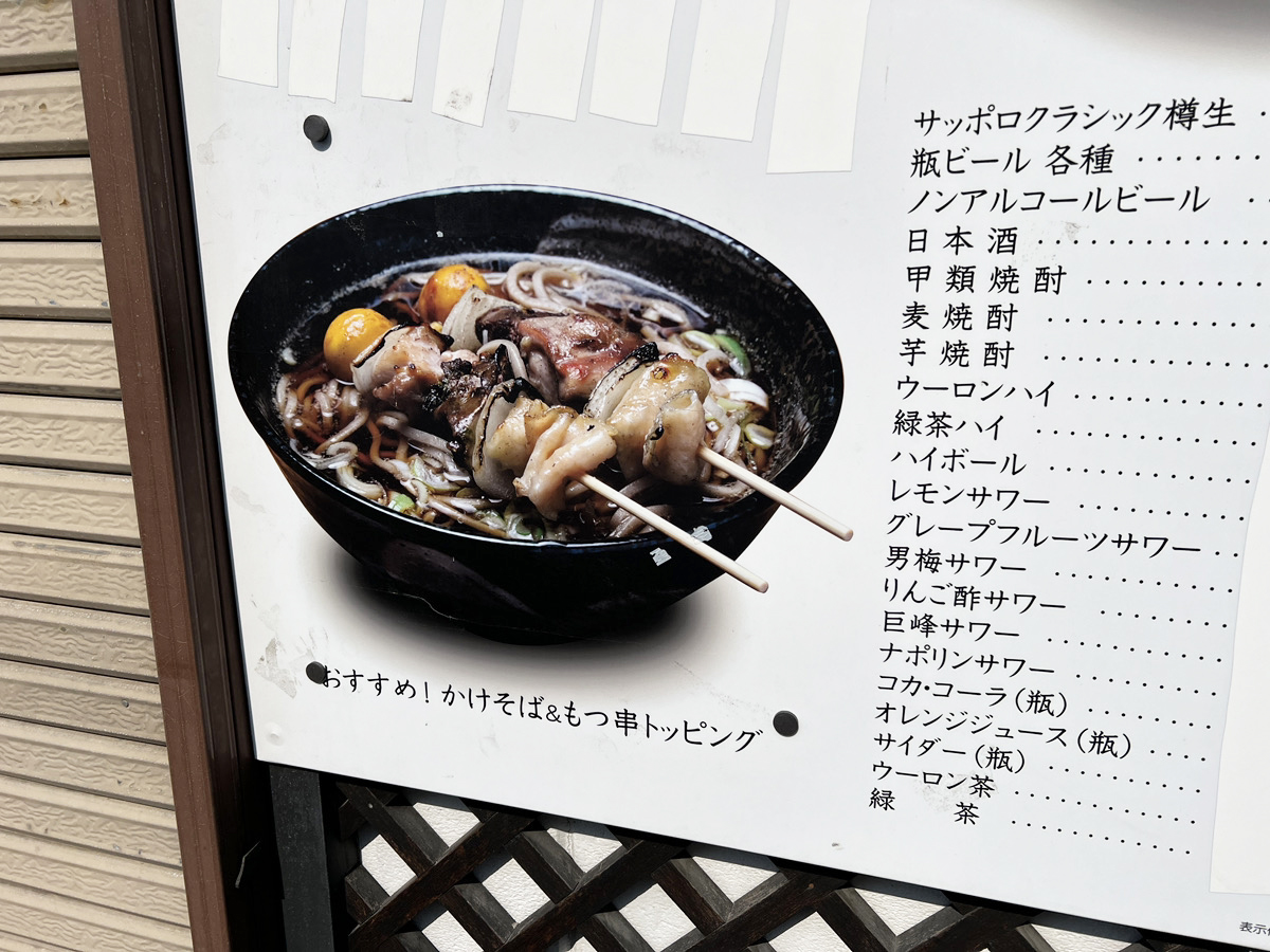 どういうことだってばよ!? 旭川の街を歩いていたら衝撃の看板を見つけた。その看板は飲み屋の軒先のメニュー看板で、ある温そばがおすすめされていたのだが、なんともつ串がトッピングされているのである。