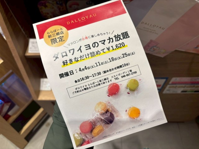 マカ放題は、ダロワイヨの人気マカロンを制限時間内に専用袋へ好きなだけ詰められるというイベントだ。