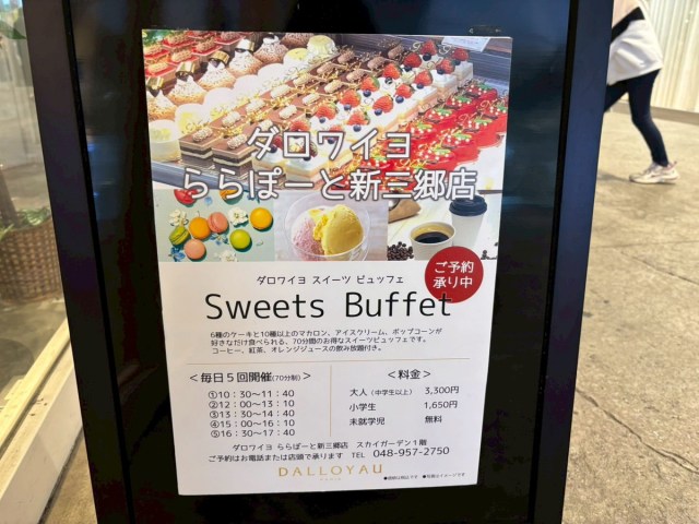 料金は大人3300円で、6種のケーキ、10種以上のマカロン、アイスクリーム、ポップコーン、ドリンクなどが70分間食べ飲み放題とのこと。(新三郷店の場合。店舗により内容・価格は異なる)