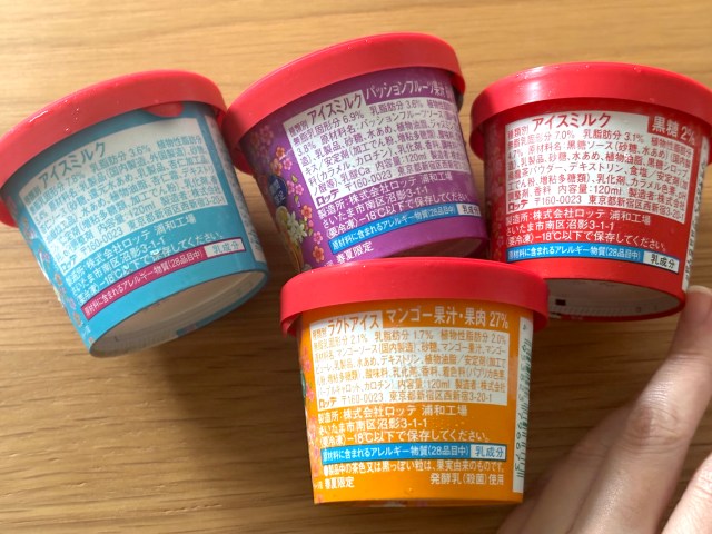アイスの区分は「マンゴーラッシー」だけラクトアイス(乳固形分3%以上)で、残り3種はアイスミルク(乳固形分10%以上)という感じ。