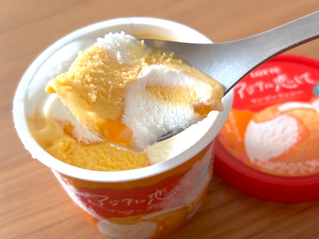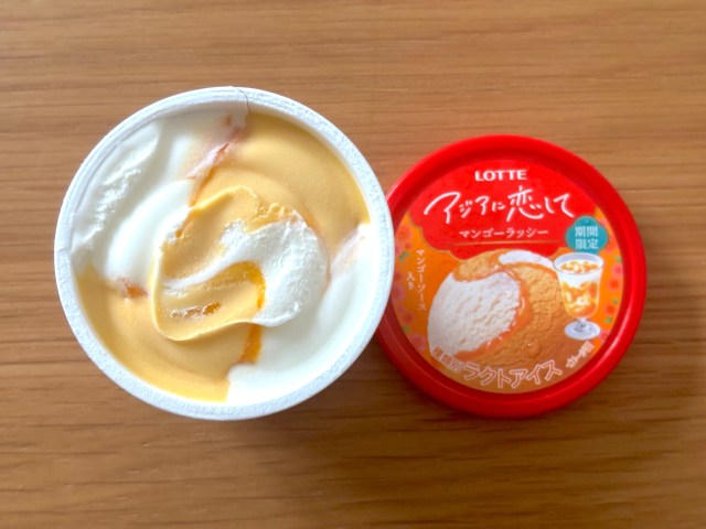 さて、お次は期間限定の「マンゴーラッシー」。唯一のラクトアイスでもあります。こちらはラッシー味とマンゴー味のアイス、そしてマンゴーソースという構成。アルフォンソマンゴーを27%使用しているそうな。
