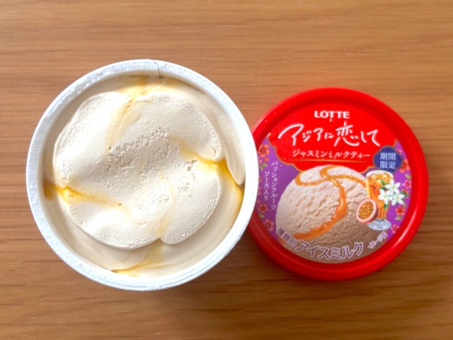 そしてラストは期間限定の「ジャスミンミルクティー」。これ、気が利いてるなと思ったのがパッションフルーツソース入りというところ……! ちなみに、スーパーで一番売れてたのもこれでした。