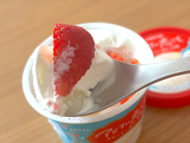 シンプルだからこそ、自分でフルーツやジャムをトッピングしたりしてアレンジできるところもいいと思います! 試しにイチゴをカットして一緒に食べてみたけど、アイスの風味が濃いので負けないんですよね。