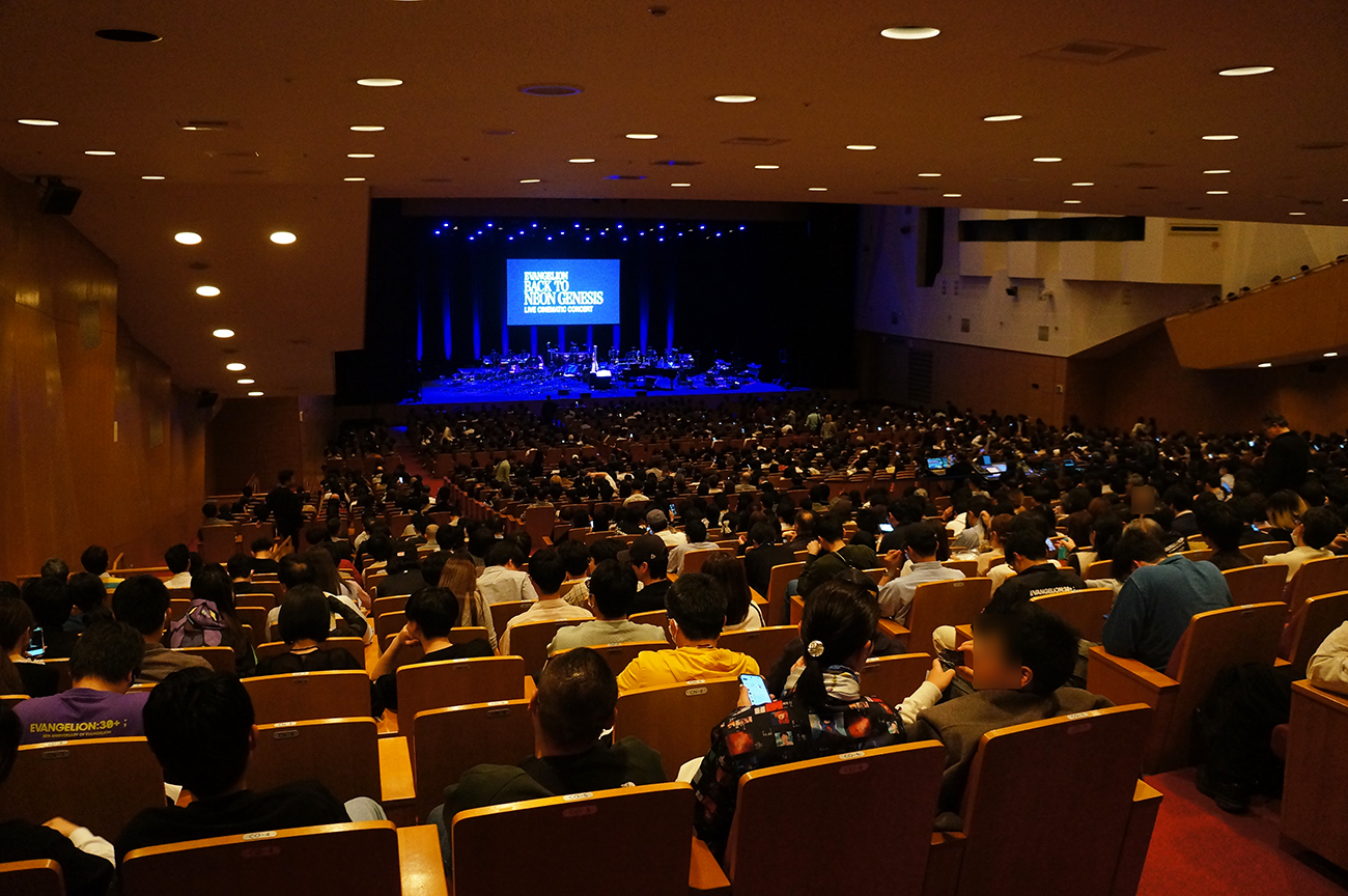 会場の席に座ると、ステージ正面奥に大きいスクリーンがあって、その前にオーケストラがセットされている。このスクリーンで『エヴァンゲリオン』シリーズの映像を流しつつ、それに合わせて生のオーケストラコンサートをするというからファンとしては贅沢に感じざるを得ない。