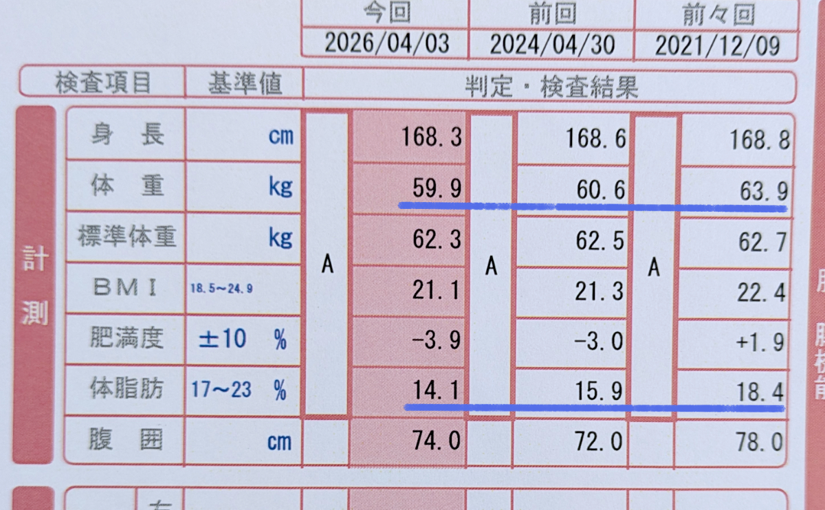 この5年の間にも少しずつ体重の減少は続いており、今日の計測で59.9キロ。私の身長で病気にかかりにくい健康的な体重とされる「標準体重」は62.3キロなので、肥満度マイナス3.9%で、標準体重よりやや軽め。ちなみに体脂肪率は14.1%だ。