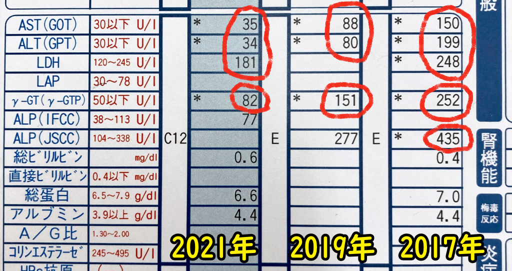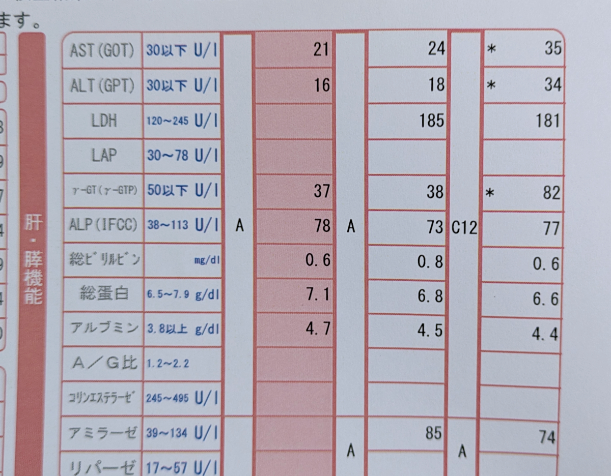 とくにAST(肝臓や筋肉の細胞内にある酵素の数値)、ALT(GPT、肝細胞に含まれる酵素の数値)、γ-GT(γ-GTP、ガンマ・ジーティーピー。肝臓や胆管の細胞に含まれる酵素の数値)の3つの数値は今年が1番良い。