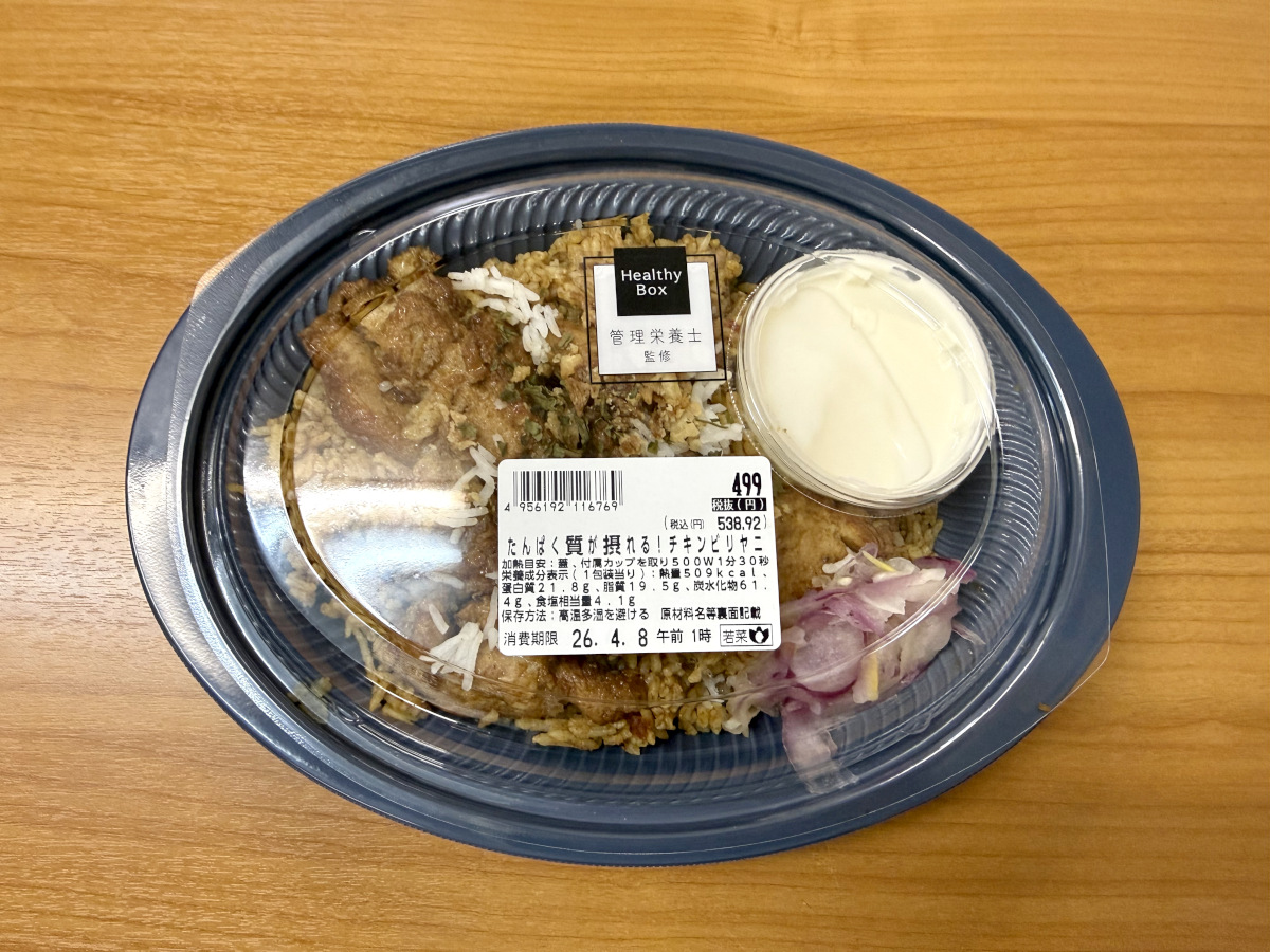 お目当てのビリヤニの正式な商品名は『たんぱく質が摂れる! チキンビリヤニ』で価格は538円。SNS等の情報によると「バスマティ米」を使用した本格的なビリヤニとのことだ。