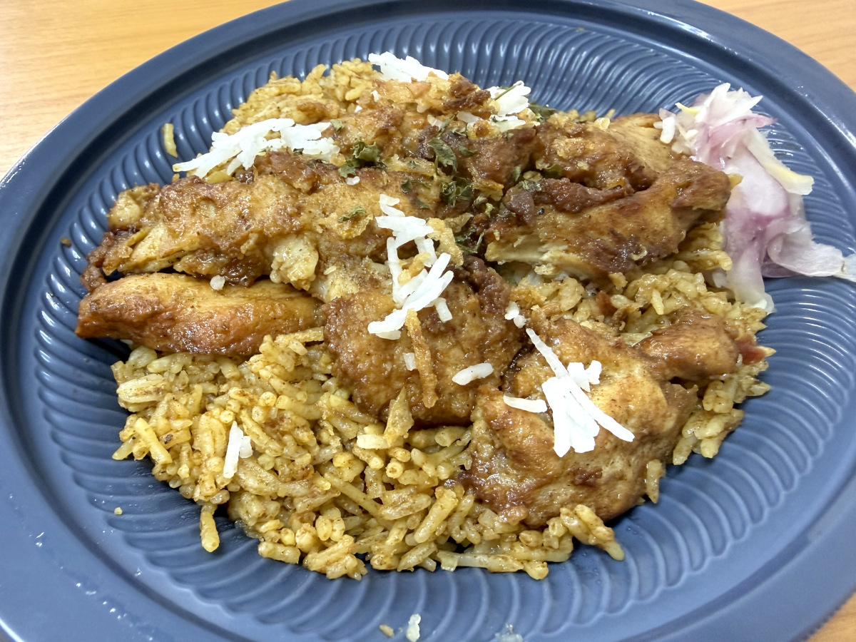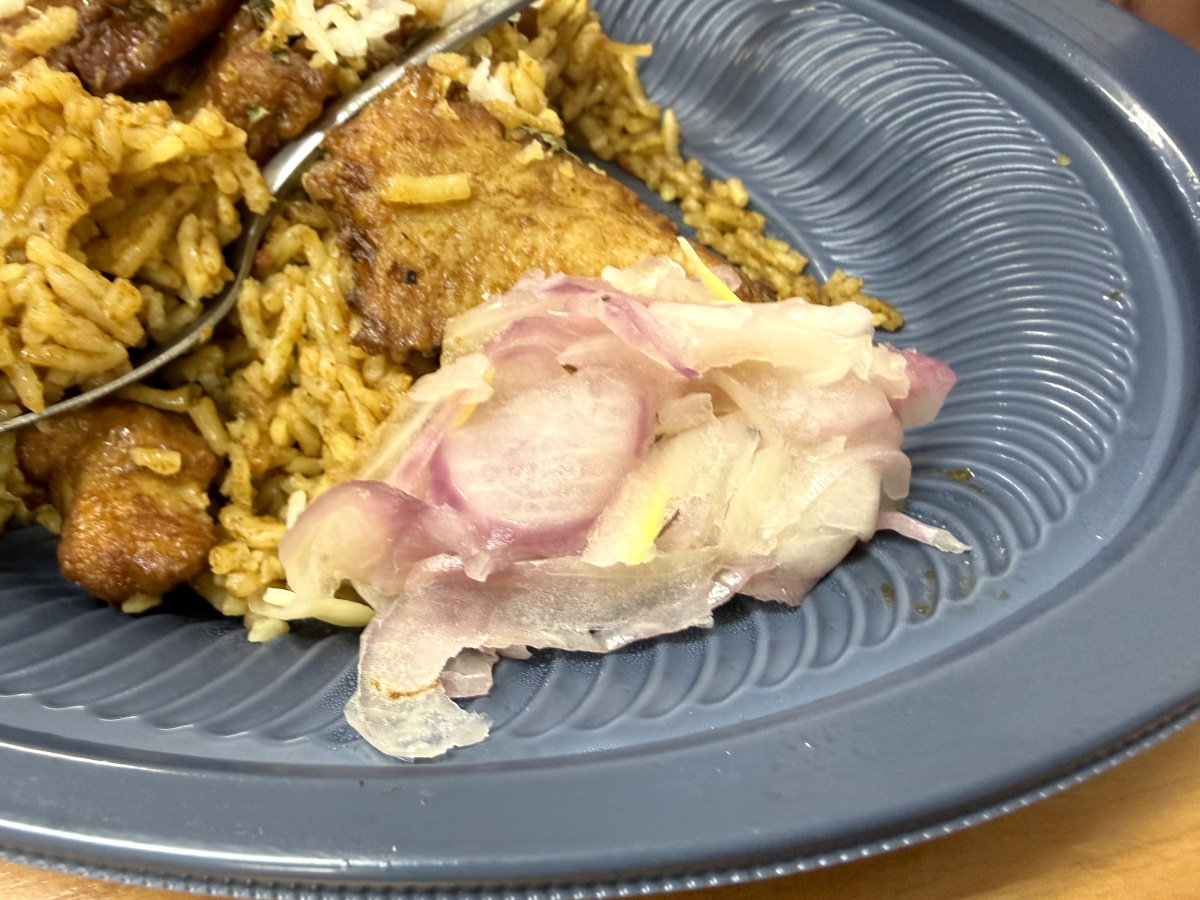 ウワサを確かめるべく持ち帰ったビリヤニを温めて食べてみることに。しっかりチキンもトッピングされており、玉ねぎのアチャール(漬物)も添えられていた。米もウワサ通りのバスマティ米である。