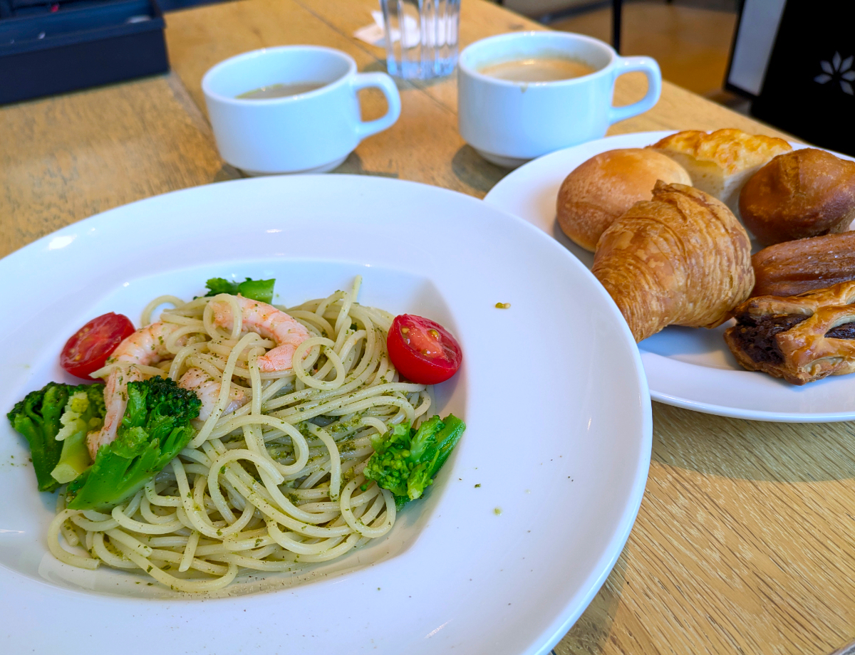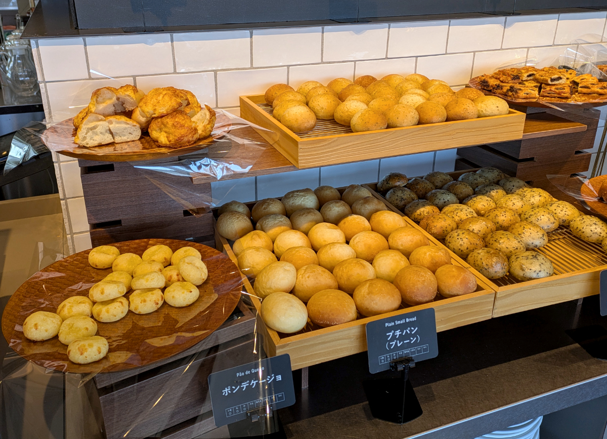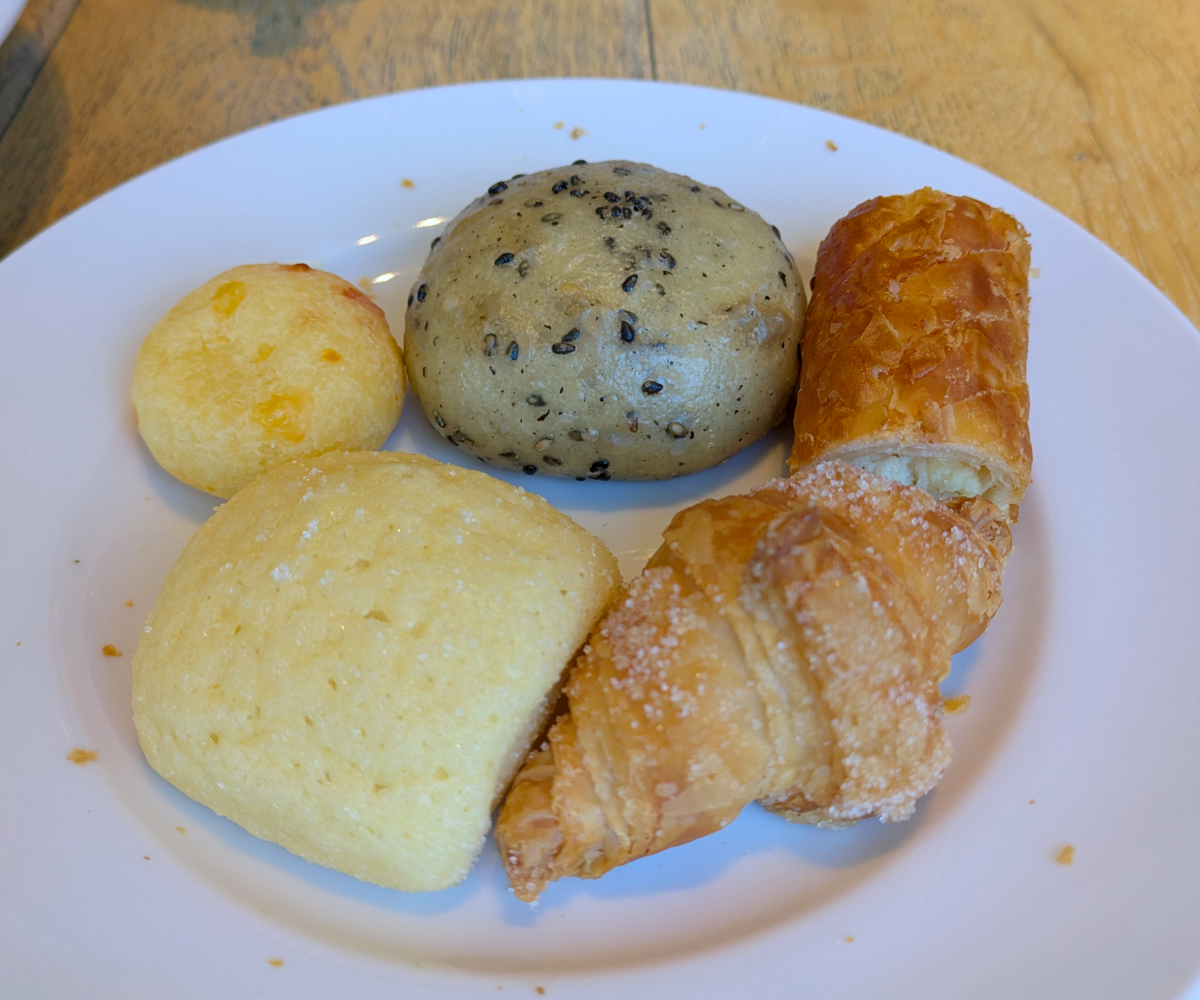 続いて持ってきたのは、メロンパン・パイクロワッサン・チーズデニッシュ・ごまのプチパン・ポンデケージョの5個だ。この段階で、当サイトのあひるねこが鎌倉パスタで食べた10個を超えた。