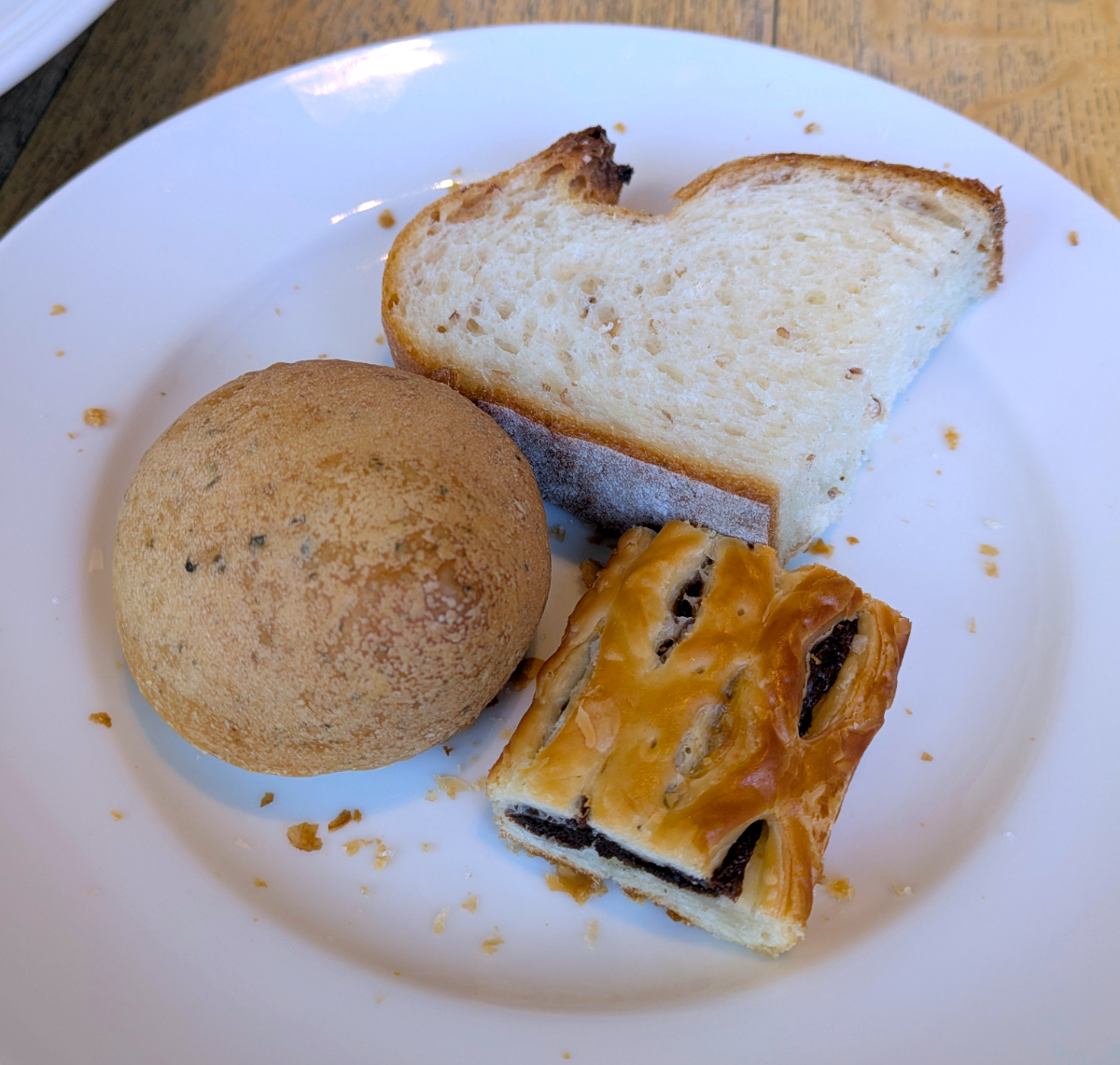 2皿目を食べ終えて、さらにおかわり。次はバジルのプチパン・ライ麦パン、そして再びチョコデニッシュの計3個。最終的に14個のパンを堪能した。
