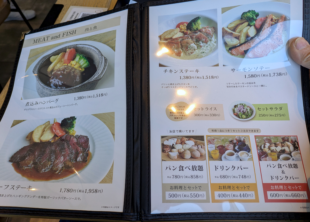 メニューを見ると、ハンバーグやパスタなどのメイン料理が並んでいる。それら1品とパンビュッフェ・ドリンクバーを組み合わせることができるのだ。
