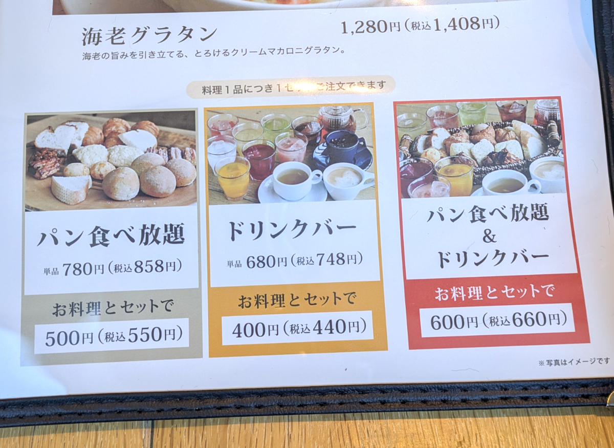 1品+パン食べ放題が税込550円、1品+ドリンクバーが税込440円。パン食べ放題・ドリンクバーを付けると税込660円である。この価格は平日(月~金曜)価格で土日祝はパン食べ放題・ドリンクバー単体がそれぞれ+110円。両方をつけると+220円となる。